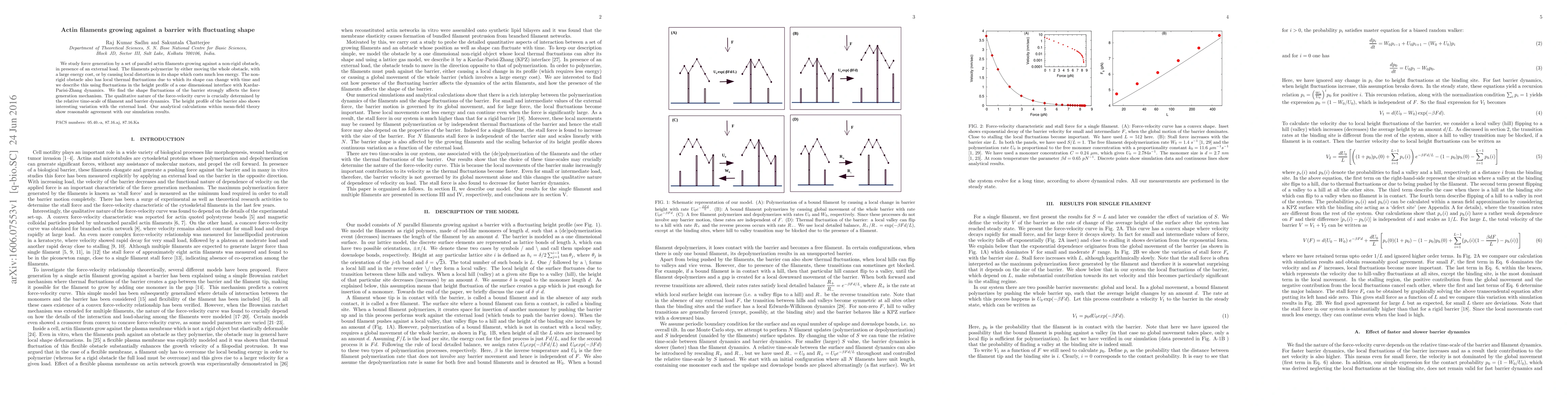 This paper investigates how actin filaments generate force when growing against a fluctuating, non-rigid barrier, finding that barrier shape fluctuations significantly influence force generation. The study reveals the critical role of the relative dynamics between filament and barrier in determining the force-velocity relationship.