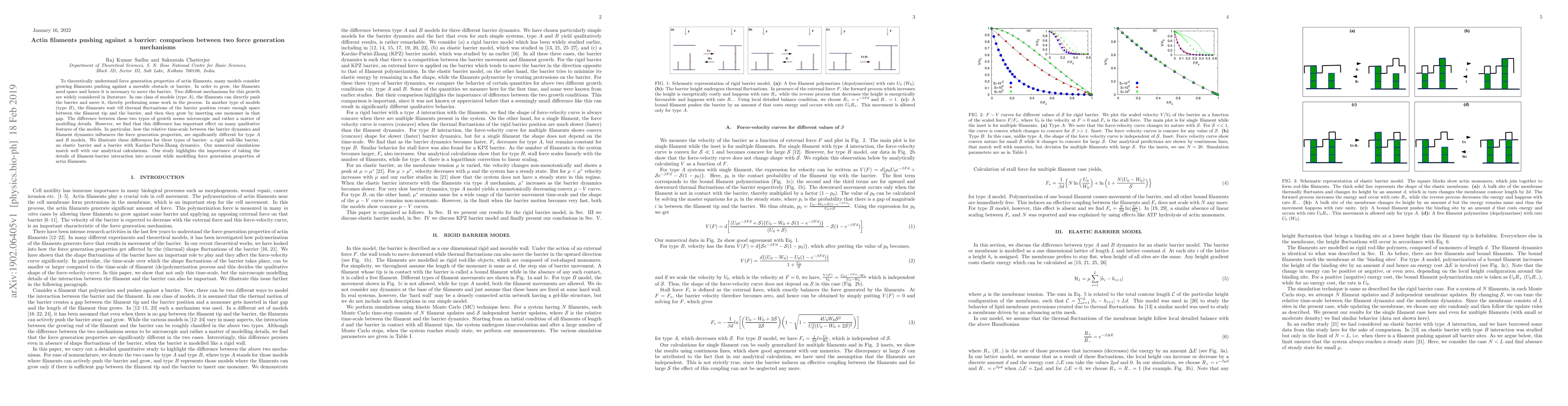 The study theoretically compares two force generation mechanisms of actin filaments growing against a barrier using numerical simulations and analytical calculations.