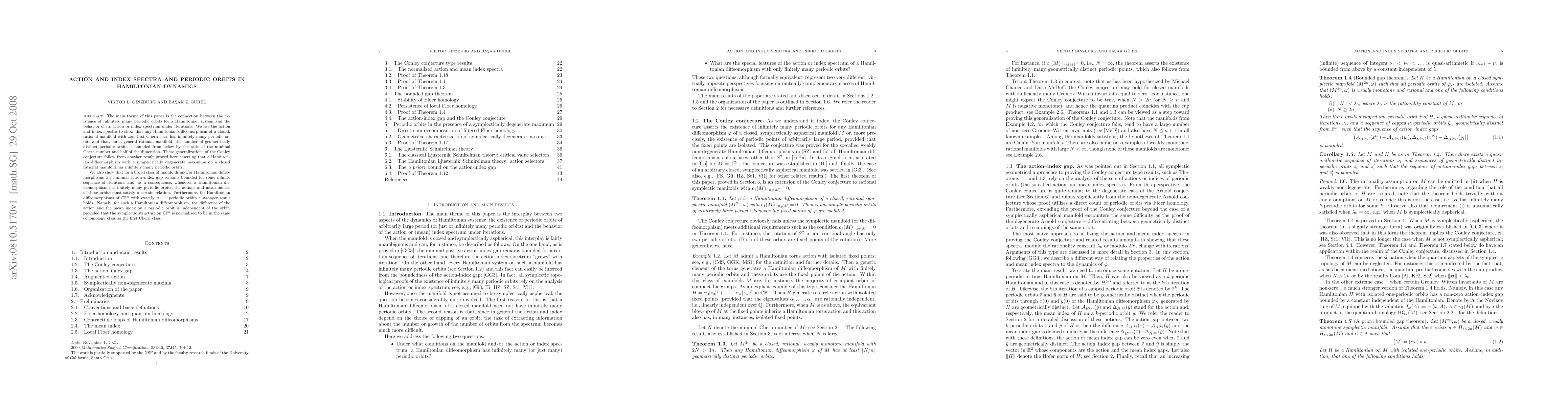 This paper explores the relationship between periodic orbits in Hamiltonian systems and the behavior of their action and index spectra. It demonstrates that Hamiltonian diffeomorphisms on closed, rational manifolds with zero first Chern class exhibit infinitely many periodic orbits, and generalizes the Conley conjecture for such systems.