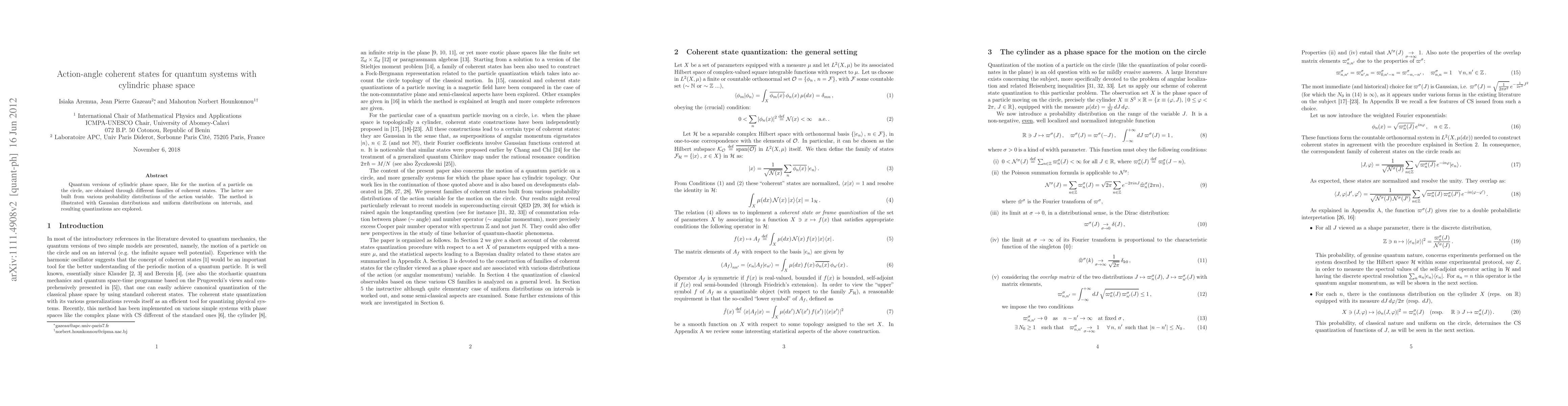 Quantum versions of cylindric phase space, like for the motion of a particle on the circle, are obtained through different families of coherent states. The latter are built from various probability distributions of the action variable. The method is illustrated with Gaussian distributions and uniform distributions on intervals, and resulting quantizations are explored.