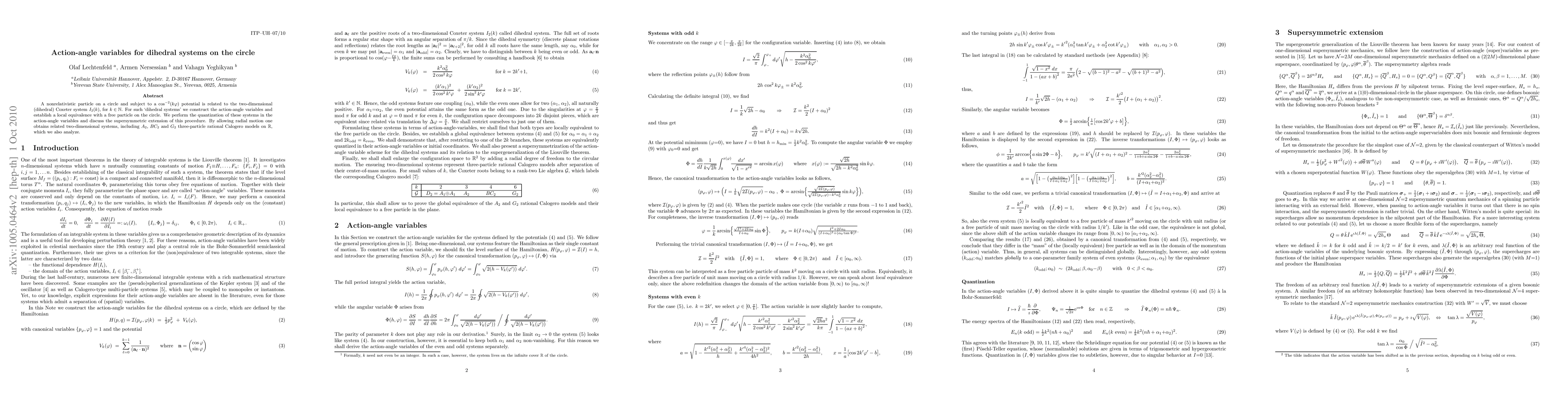 This paper constructs action-angle variables for dihedral systems on a circle influenced by a specific potential, establishing their local equivalence to free particles. The study quantizes these systems and explores their supersymmetric extensions, and extends the analysis to related two-dimensional systems, including A_2, BC_2, and G_2 three-particle Calogero models.