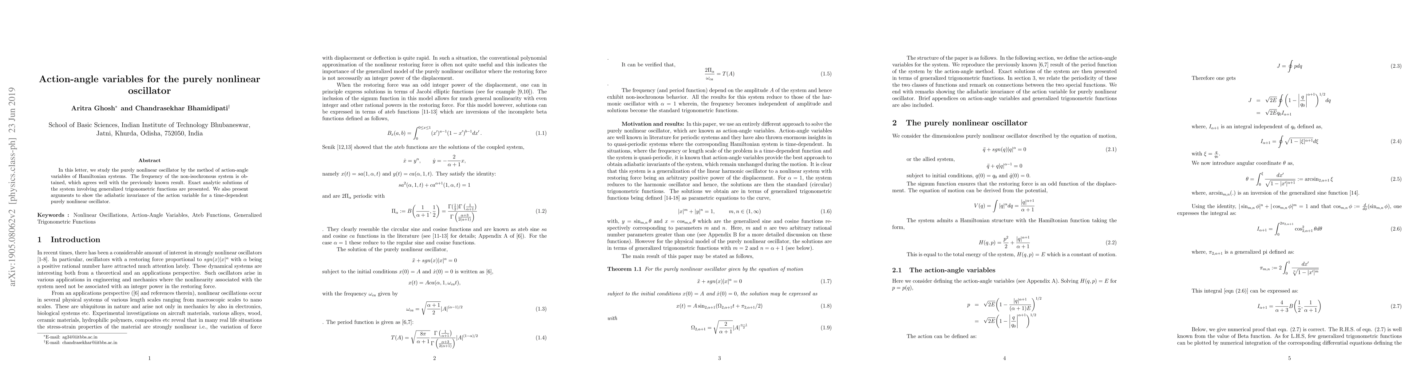 This paper explores the purely nonlinear oscillator using action-angle variables, deriving exact analytic solutions and confirming the frequency of the non-isochronous system. It also demonstrates the adiabatic invariance of the action variable for time-dependent systems.