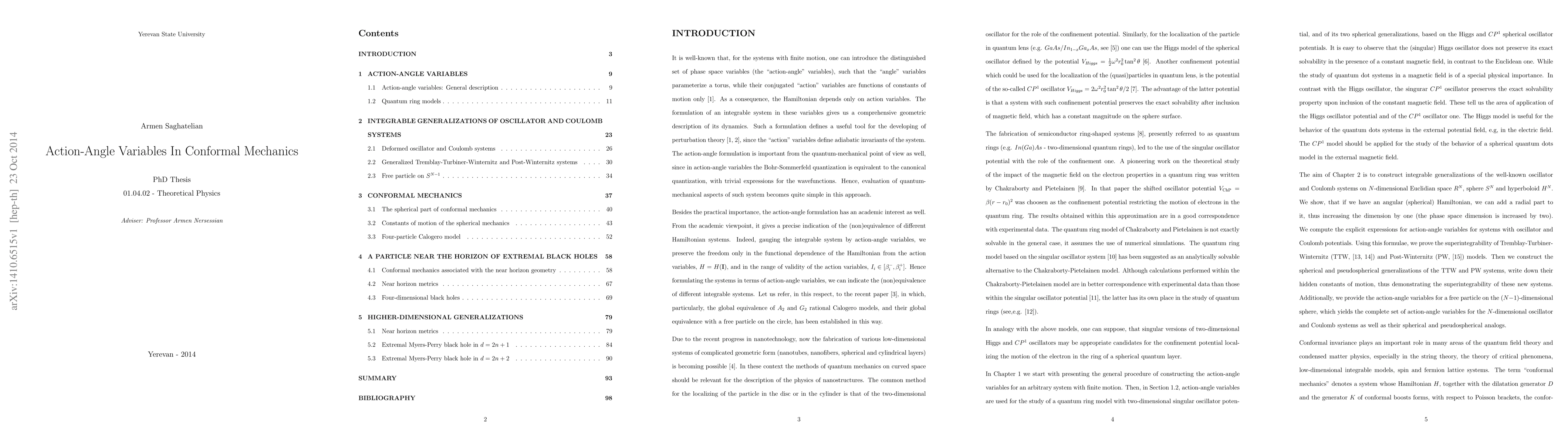- We have suggested using the action-angle variables for the study of a (quasi)particle in quantum ring. We have presented the action-angle variables for three two-dimensional singular oscillator systems - We have suggested a procedure of constructing new integrable systems form the known ones, by adding a radial part to the angular Hamiltonian. Using this method we have constructed a class of integrable generalizations of oscillator and Coulomb systems on N-dimensional Euclidian space, sphere and hyperboloid. - We have developed the methods of study of conformal mechanics, based on separation of the radial and angular parts of the Hamiltonian of the system. - We have proved, that by applying a proper canonical transformation one can bring the conformal mechanics associated with near-horizon motion of massive relativistic particle in the field of extremal black holes in arbitrary dimensions to the conventional conformal mechanics form. - We have studied in details the near-horizon motion of massive relativistic particle in the field of extremal Reissner-Nordstrom black hole with magnetic momentum. We have analyzed the near-horizon motion of massive relativistic particle in the field of extremal Clement-Gal'tsov (Dilaton-Axion) black hole. - We have inspected the integrability of spherical mechanics models associated with the near horizon extremal Myers-Perry black hole in arbitrary dimension for the special case that all rotation parameters are equal. We have proved the superintegrability of the new system and demonstrated that the spherical mechanics associated with the black hole in odd dimensions is maximally superintegrable, while its even-dimensional counterpart lacks for only one constant of the motion to be maximally superintegrable.