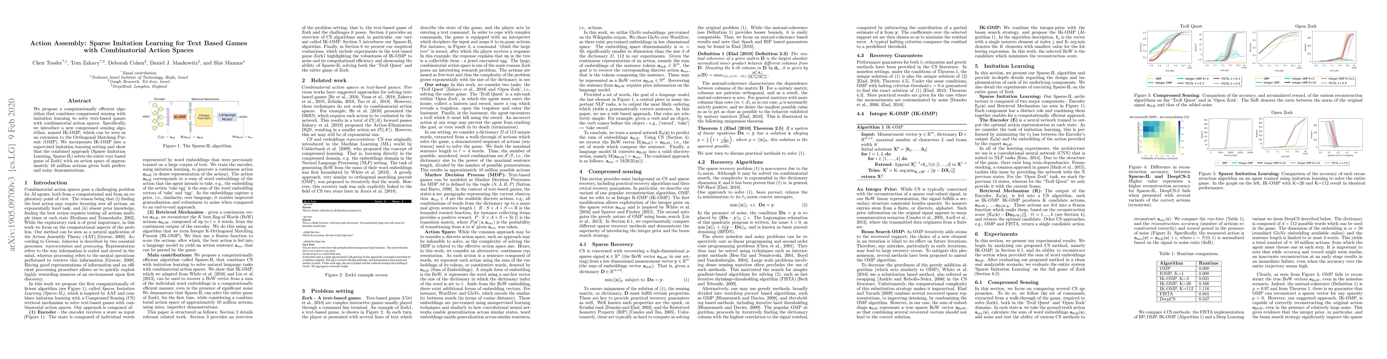 We propose a computationally efficient algorithm that combines compressed sensing with imitation learning to solve text-based games with combinatorial action spaces. Specifically, we introduce a new compressed sensing algorithm, named IK-OMP, which can be seen as an extension to the Orthogonal Matching Pursuit (OMP). We incorporate IK-OMP into a supervised imitation learning setting and show that the combined approach (Sparse Imitation Learning, Sparse-IL) solves the entire text-based game of Zork1 with an action space of approximately 10 million actions given both perfect and noisy demonstrations.