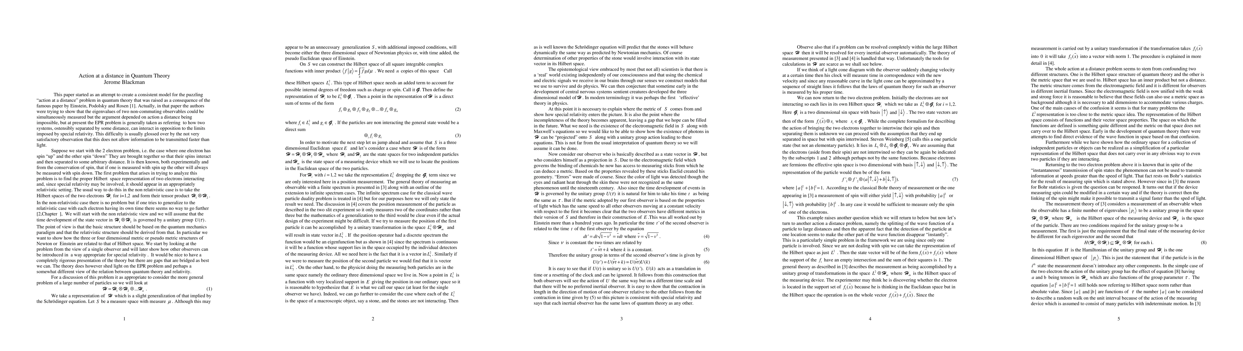 The relation between quantum theory and special relativity is peculiar. On the one hand it is close and essential. Steven Weinberg [1], for example, takes the position that the standard model is an inevitable consequence of the marriage of the two theories. On the other, the action at a distance implied by the famous paper by Einstein, Podolsky, and Rosen [2] is certainly contrary to the implications of special relativity in spite of the fact that it does not allow transmission of information. The setting of quantum theory is a Hilbert spaceH and a path inH whose development in time is governed by a one parameter group of unitary transformations while the setting for special relativity can be thought of as Minkowski space with the time development not absolute, but dependent on the inertial system of the observer. The problem is to show how these two very different viewpoints can be reconciled in a way that includes an explanation of the "action at a distance" conundrum.