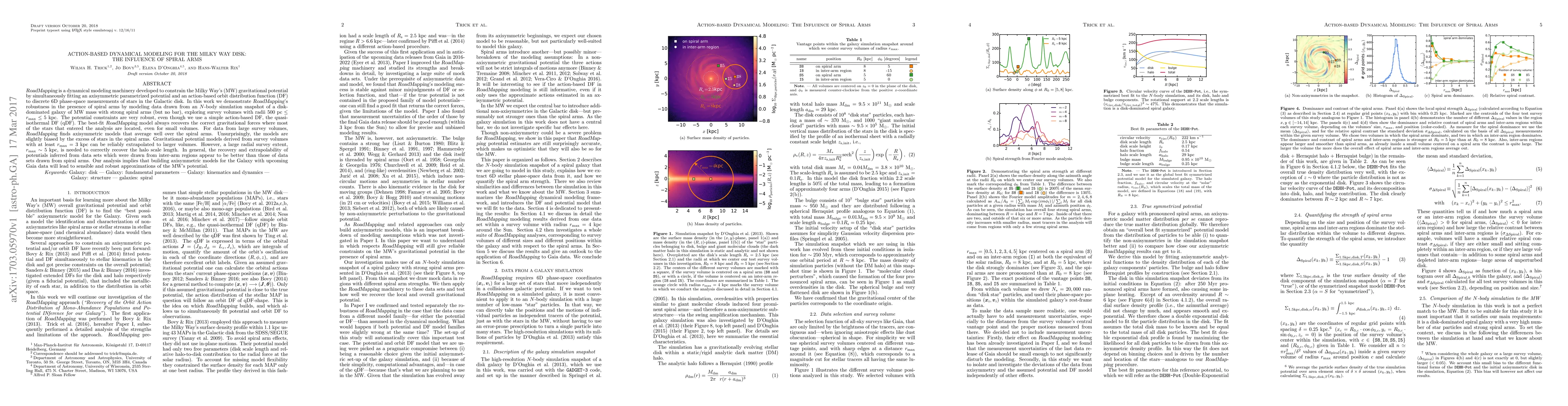 RoadMapping is a dynamical modeling machinery developed to constrain the Milky Way's (MW) gravitational potential by simultaneously fitting an axisymmetric parametrized potential and an action-based orbit distribution function (DF) to discrete 6D phase-space measurements of stars in the Galactic disk. In this work we demonstrate RoadMapping's robustness in the presence of spiral arms by modeling data drawn from an N-body simulation snapshot of a disk-dominated galaxy of MW mass with strong spiral arms (but no bar), exploring survey volumes with radii 500pc<=r_max<=5kpc. The potential constraints are very robust, even though we use a simple action-based DF, the quasi-isothermal DF (qDF). The best-fit RoadMapping model always recovers the correct gravitational forces where most of the stars that entered the analysis are located, even for small volumes. For data from large survey volumes, RoadMapping finds axisymmetric models that average well over the spiral arms. Unsurprisingly, the models are slightly biased by the excess of stars in the spiral arms. Gravitational potential models derived from survey volumes with at least r_max=3kpc can be reliably extrapolated to larger volumes. However, a large radial survey extent, r_max~5kpc, is needed to correctly recover the halo scale length. In general, the recovery and extrapolability of potentials inferred from data sets which were drawn from inter-arm regions appear to be better than those of data sets drawn from spiral arms. Our analysis implies that building axisymmetric models for the Galaxy with upcoming Gaia data will lead to sensible and robust approximations of the MW's potential.