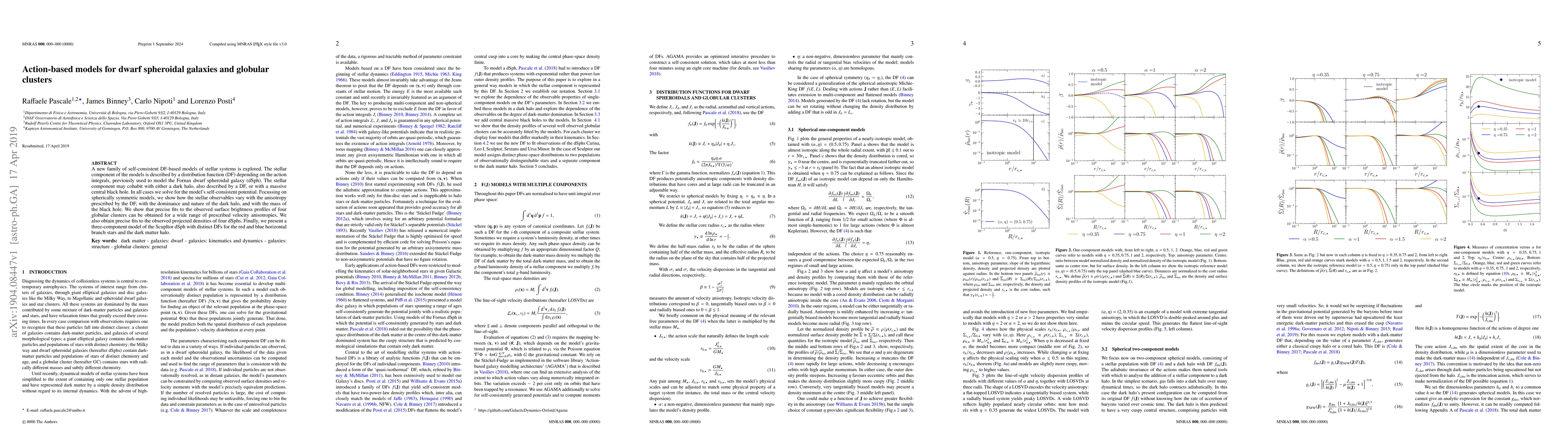 A new family of self-consistent DF-based models of stellar systems is explored. The stellar component of the models is described by a distribution function (DF) depending on the action integrals, previously used to model the Fornax dwarf spheroidal galaxy (dSph). The stellar component may cohabit with either a dark halo, also described by a DF, or with a massive central black hole. In all cases we solve for the model's self-consistent potential. Focussing on spherically symmetric models, we show how the stellar observables vary with the anisotropy prescribed by the DF, with the dominance and nature of the dark halo, and with the mass of the black hole. We show that precise fits to the observed surface brightness profiles of four globular clusters can be obtained for a wide range of prescribed velocity anisotropies. We also obtain precise fits to the observed projected densities of four dSphs. Finally, we present a three-component model of the Scupltor dSph with distinct DFs for the red and blue horizontal branch stars and the dark matter halo.