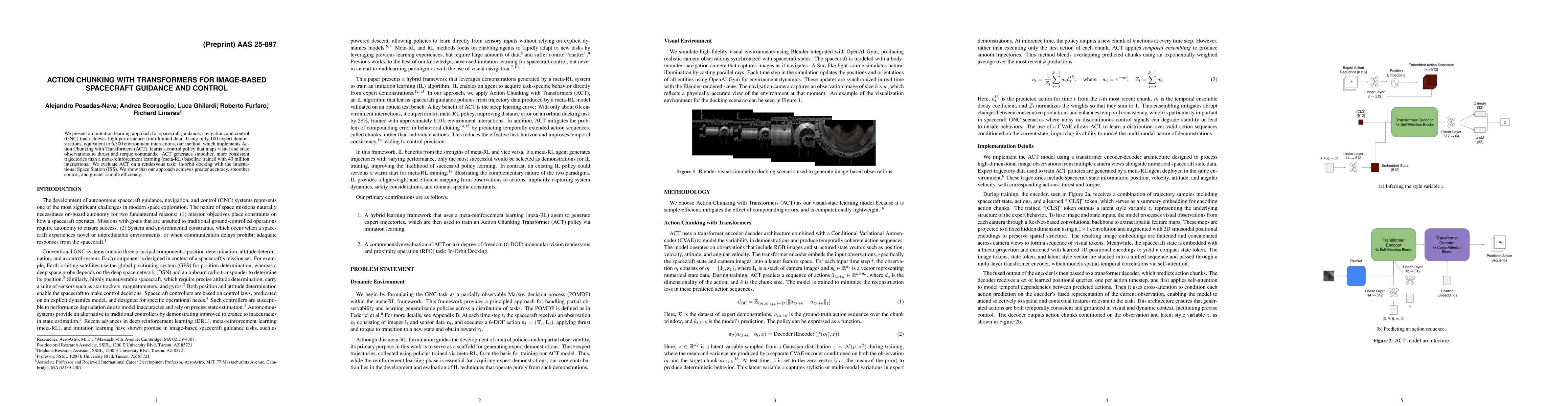 We present an imitation learning approach for spacecraft guidance, navigation, and control(GNC) that achieves high performance from limited data. Using only 100 expert demonstrations, equivalent to 6,300 environment interactions, our method, which implements Action Chunking with Transformers (ACT), learns a control policy that maps visual and state observations to thrust and torque commands. ACT generates smoother, more consistent trajectories than a meta-reinforcement learning (meta-RL) baseline trained with 40 million interactions. We evaluate ACT on a rendezvous task: in-orbit docking with the International Space Station (ISS). We show that our approach achieves greater accuracy, smoother control, and greater sample efficiency.