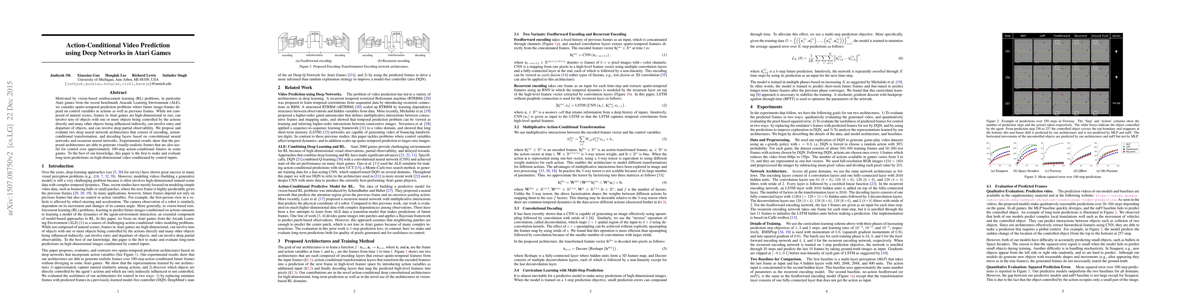 This paper proposes deep neural network architectures for action-conditional video prediction in Atari games, focusing on generating future frames based on current actions and previous frames. The results demonstrate the effectiveness of the proposed models in producing visually realistic and useful long-term predictions over 100-step action-conditional futures.