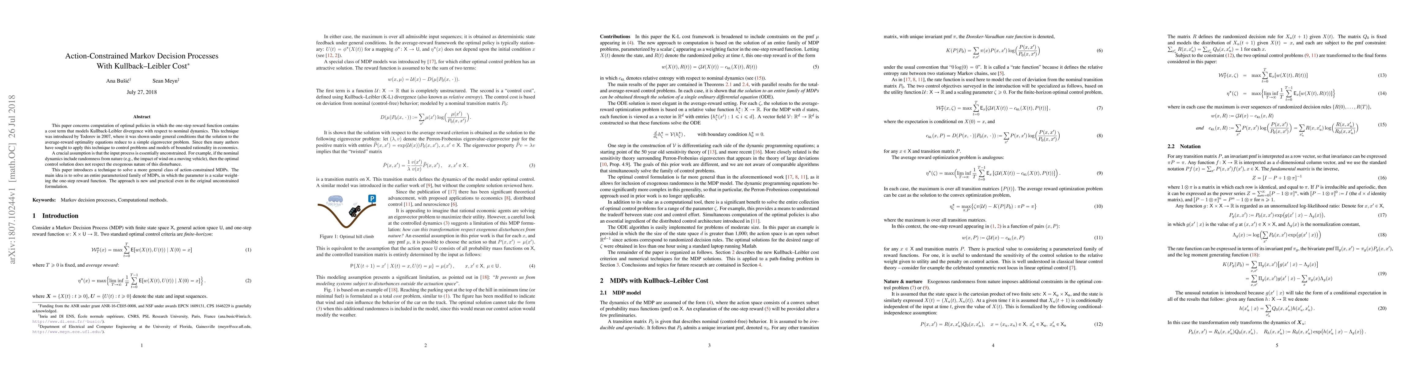 This paper concerns computation of optimal policies in which the one-step reward function contains a cost term that models Kullback-Leibler divergence with respect to nominal dynamics. This technique was introduced by Todorov in 2007, where it was shown under general conditions that the solution to the average-reward optimality equations reduce to a simple eigenvector problem. Since then many authors have sought to apply this technique to control problems and models of bounded rationality in economics. A crucial assumption is that the input process is essentially unconstrained. For example, if the nominal dynamics include randomness from nature (e.g., the impact of wind on a moving vehicle), then the optimal control solution does not respect the exogenous nature of this disturbance. This paper introduces a technique to solve a more general class of action-constrained MDPs. The main idea is to solve an entire parameterized family of MDPs, in which the parameter is a scalar weighting the one-step reward function. The approach is new and practical even in the original unconstrained formulation.