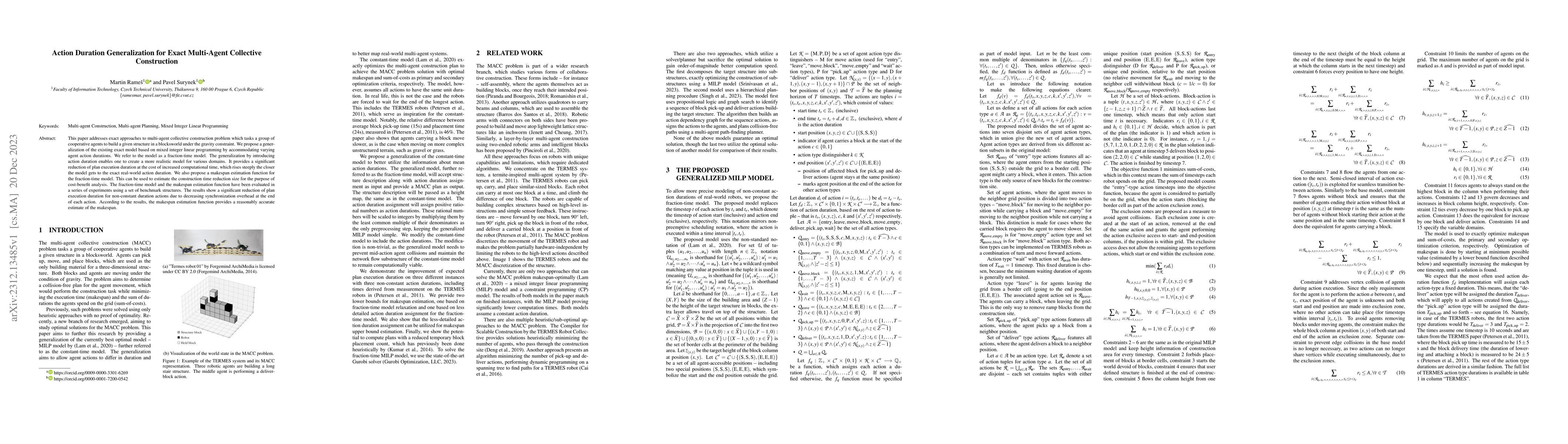 This paper addresses exact approaches to multi-agent collective construction problem which tasks a group of cooperative agents to build a given structure in a blocksworld under the gravity constraint. We propose a generalization of the existing exact model based on mixed integer linear programming by accommodating varying agent action durations. We refer to the model as a fraction-time model. The generalization by introducing action duration enables one to create a more realistic model for various domains. It provides a significant reduction of plan execution duration at the cost of increased computational time, which rises steeply the closer the model gets to the exact real-world action duration. We also propose a makespan estimation function for the fraction-time model. This can be used to estimate the construction time reduction size for the purpose of cost-benefit analysis. The fraction-time model and the makespan estimation function have been evaluated in a series of experiments using a set of benchmark structures. The results show a significant reduction of plan execution duration for non-constant duration actions due to decreasing synchronization overhead at the end of each action. According to the results, the makespan estimation function provides a reasonably accurate estimate of the makespan.