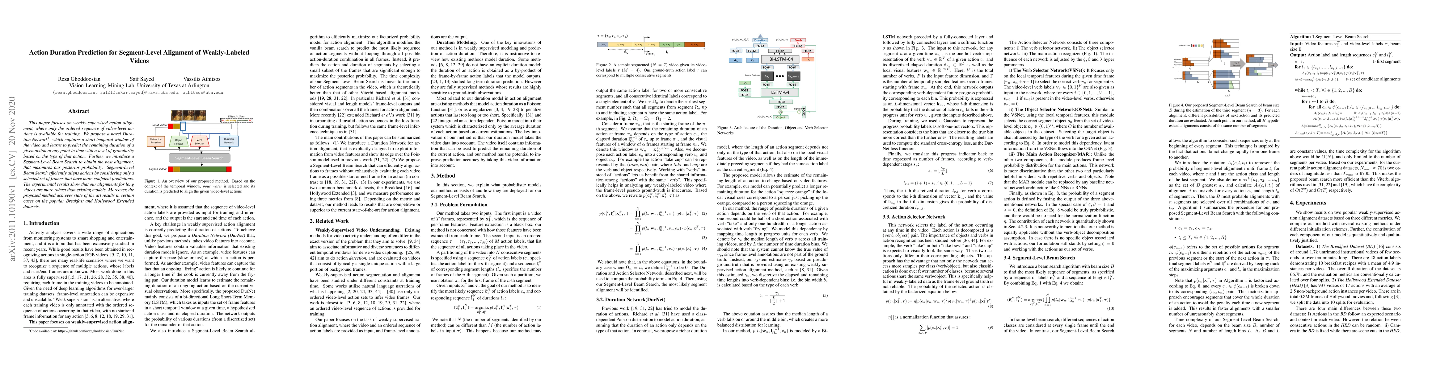 This paper focuses on weakly-supervised action alignment, where only the ordered sequence of video-level actions is available for training. We propose a novel Duration Network, which captures a short temporal window of the video and learns to predict the remaining duration of a given action at any point in time with a level of granularity based on the type of that action. Further, we introduce a Segment-Level Beam Search to obtain the best alignment, that maximizes our posterior probability. Segment-Level Beam Search efficiently aligns actions by considering only a selected set of frames that have more confident predictions. The experimental results show that our alignments for long videos are more robust than existing models. Moreover, the proposed method achieves state of the art results in certain cases on the popular Breakfast and Hollywood Extended datasets.