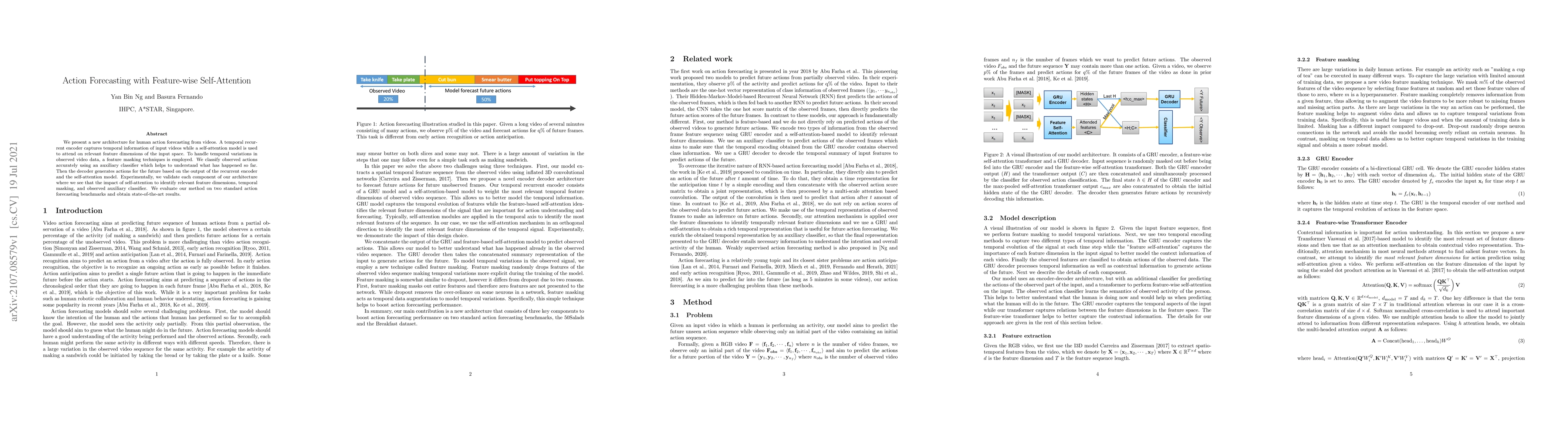 This paper introduces a novel architecture for human action forecasting in videos, combining a temporal recurrent encoder with a self-attention model to focus on relevant feature dimensions. The method includes feature masking to handle temporal variations and an auxiliary classifier to classify observed actions, achieving state-of-the-art results on two benchmarks.