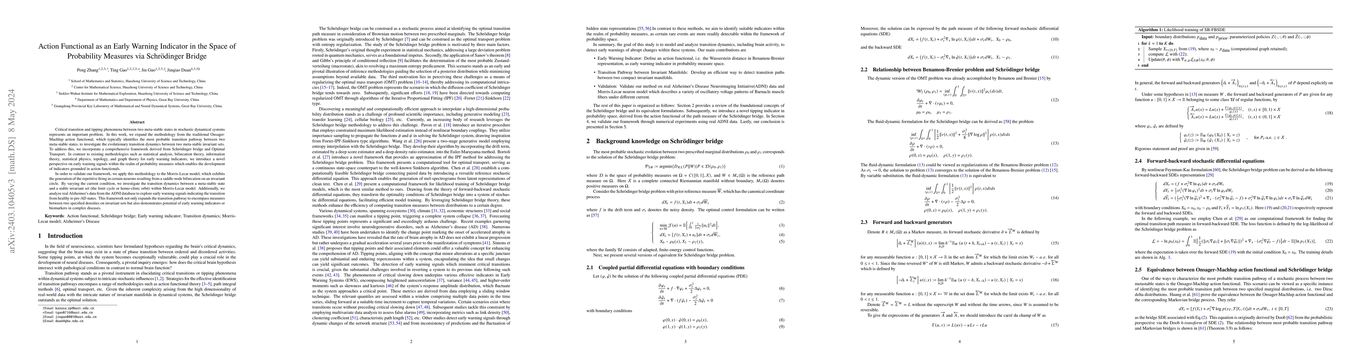 This research develops a novel framework using Schr\"odinger bridge and Optimal Transport to identify early warning signals for critical transitions in stochastic dynamical systems. Unlike traditional methods, this approach leverages action functionals derived from probability measures, demonstrated through the Morris-Lecar model and real Alzheimer's data from the ADNI database.