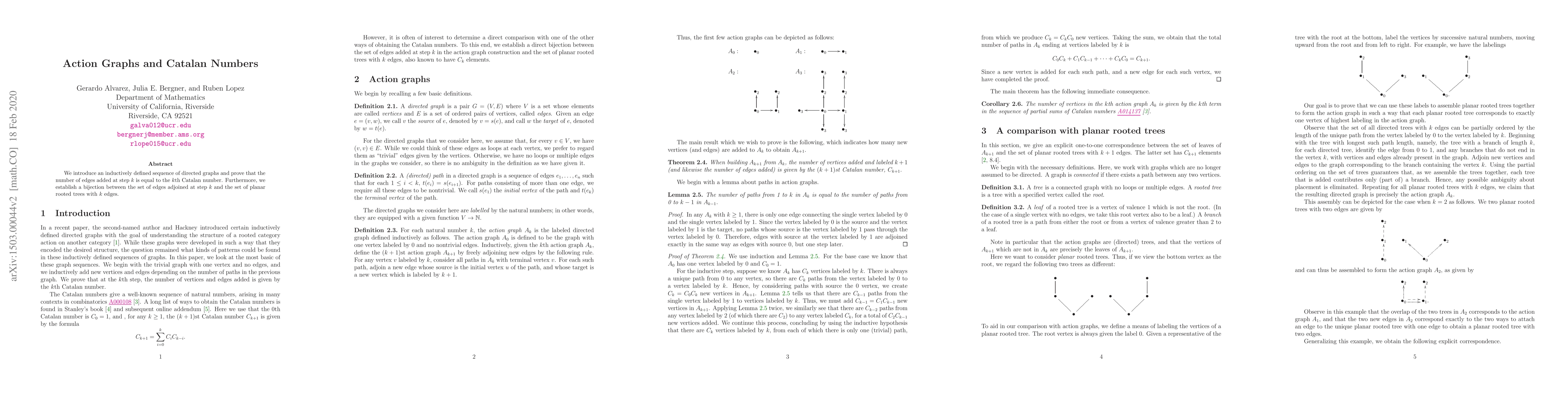 We introduce an inductively defined sequence of directed graphs and prove that the number of edges added at step $k$ is equal to the $k$th Catalan number. Furthermore, we establish an isomorphism between the set of edges adjoined at step $k$ and the set of planar rooted trees with $k$ edges.