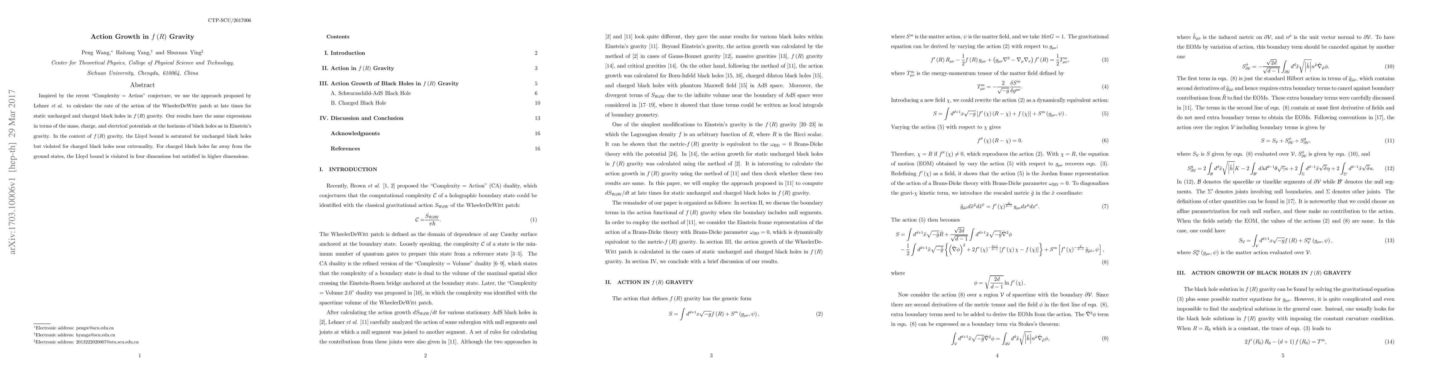 This paper calculates the action growth rate in $f(R)$ gravity for static black holes, finding similar expressions as in Einstein's gravity. It shows that the Lloyd bound is saturated for uncharged black holes but violated for charged black holes, with behavior differing based on proximity to extremality and the number of dimensions.