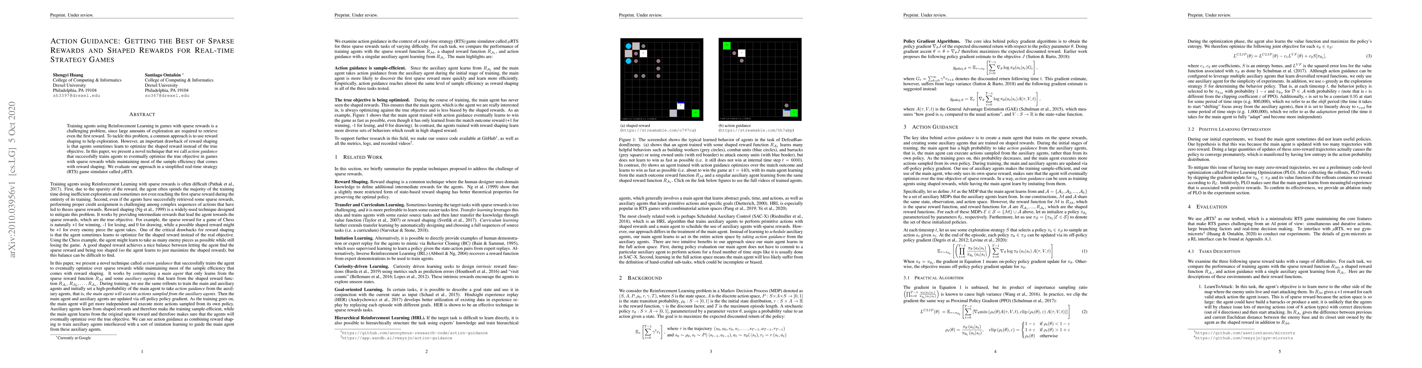Researchers present a novel technique called action guidance that successfully trains agents to optimize true objectives in real-time strategy games with sparse rewards while maintaining sample efficiency. This approach overcomes the limitations of traditional reward shaping methods.