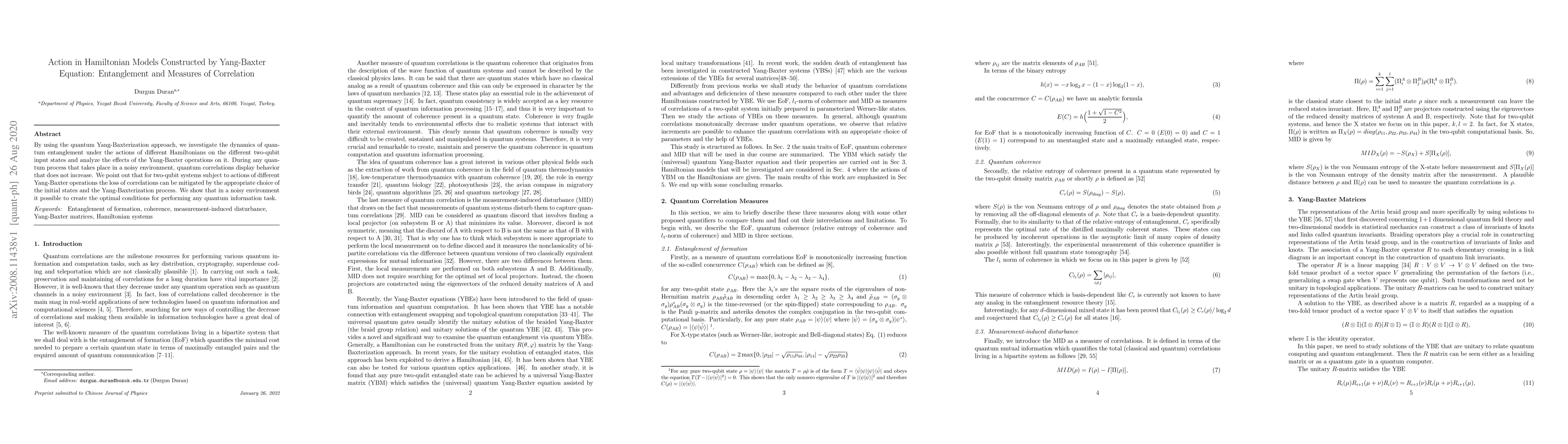 By using the quantum Yang-Baxterization approach, we investigate the dynamics of quantum entanglement under the actions of different Hamiltonians on the different two-qubit input states and analyze the effects of the Yang-Baxter operations on it. During any quantum process that takes place in a noisy environment, quantum correlations display behavior that does not increase. We point out that for two-qubit systems subject to actions of different Yang-Baxter operations the loss of correlations can be mitigated by the appropriate choice of the initial states and the Yang-Baxterization process. We show that in a noisy environment it possible to create the optimal conditions for performing any quantum information task.