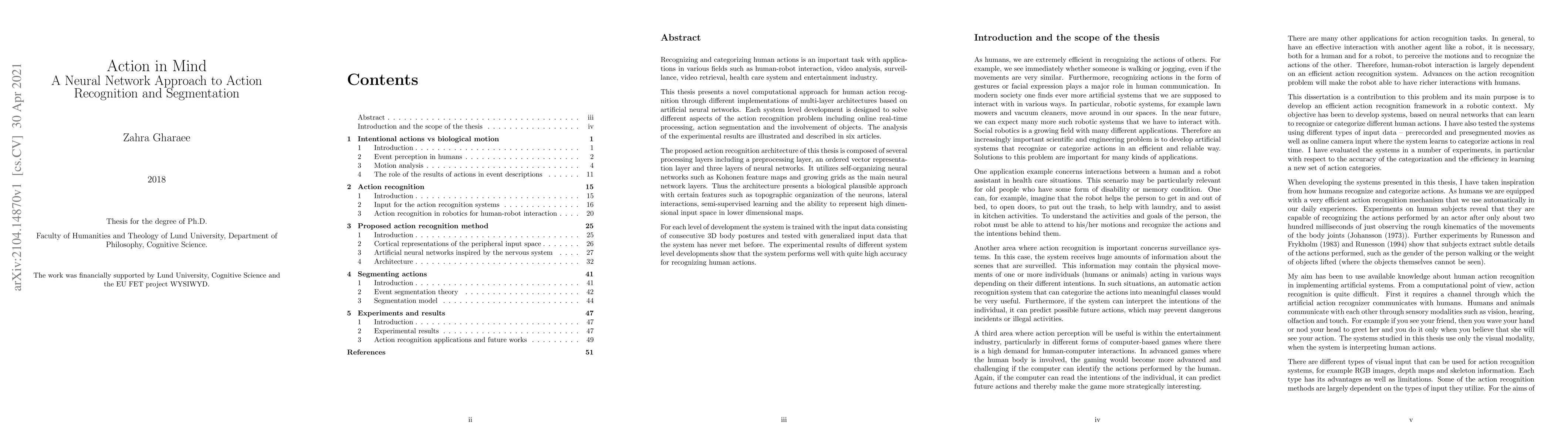 Recognizing and categorizing human actions is an important task with applications in various fields such as human-robot interaction, video analysis, surveillance, video retrieval, health care system and entertainment industry. This thesis presents a novel computational approach for human action recognition through different implementations of multi-layer architectures based on artificial neural networks. Each system level development is designed to solve different aspects of the action recognition problem including online real-time processing, action segmentation and the involvement of objects. The analysis of the experimental results are illustrated and described in six articles. The proposed action recognition architecture of this thesis is composed of several processing layers including a preprocessing layer, an ordered vector representation layer and three layers of neural networks. It utilizes self-organizing neural networks such as Kohonen feature maps and growing grids as the main neural network layers. Thus the architecture presents a biological plausible approach with certain features such as topographic organization of the neurons, lateral interactions, semi-supervised learning and the ability to represent high dimensional input space in lower dimensional maps. For each level of development the system is trained with the input data consisting of consecutive 3D body postures and tested with generalized input data that the system has never met before. The experimental results of different system level developments show that the system performs well with quite high accuracy for recognizing human actions.
