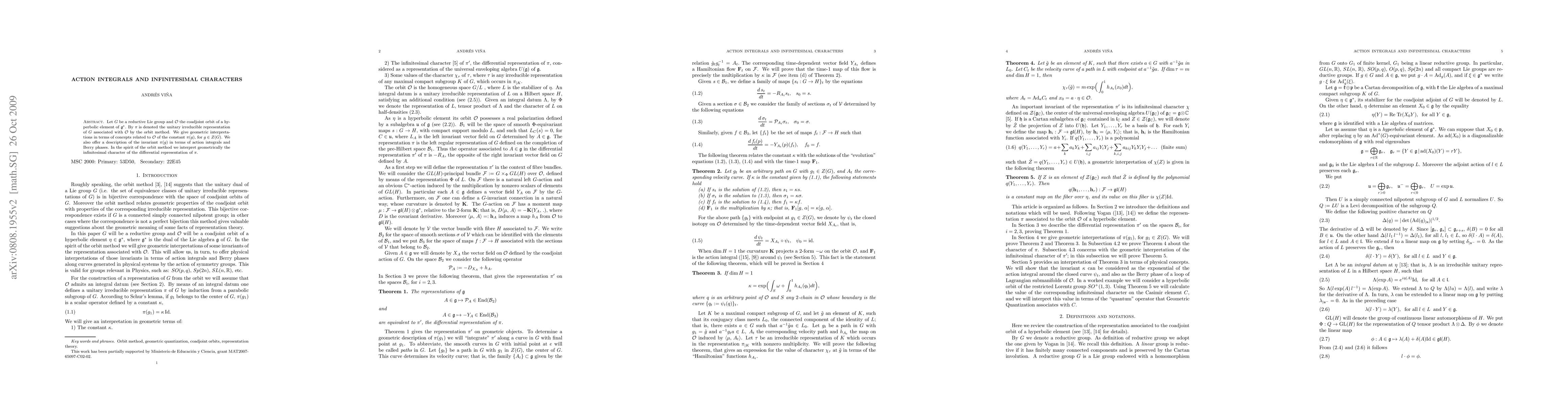 Let $G$ be a reductive Lie group and ${\mathcal O}$ the coadjoint orbit of a hyperbolic element of ${\frak g}^*$. By $\pi$ is denoted the unitary irreducible representation of $G$ associated with ${\mathcal O}$ by the orbit method. We give geometric interpretations in terms of concepts related to ${\mathcal O}$ of the constant $\pi(g)$, for $g\in Z(G)$. We also offer a description of the invariant $\pi(g)$ in terms of action integrals and Berry phases. In the spirit of the orbit method we interpret geometrically the infinitesimal character of the differential representation of $\pi$.