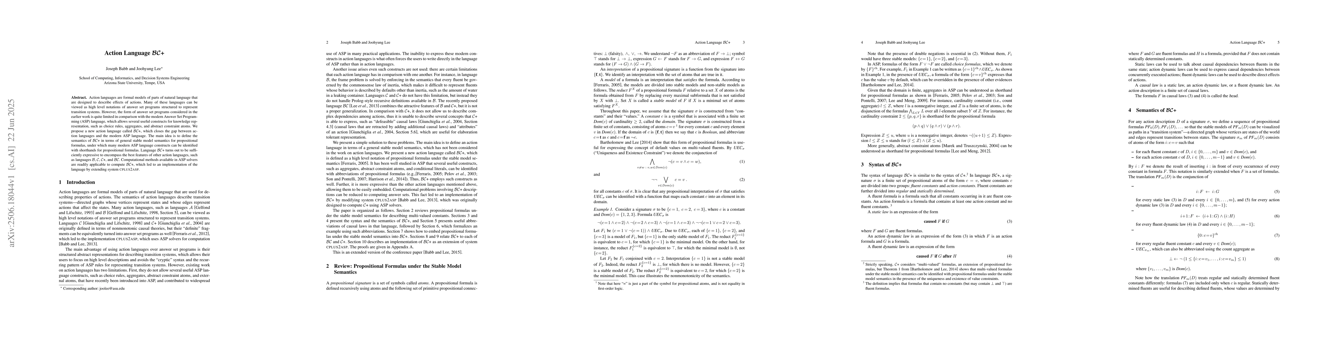 Action languages are formal models of parts of natural language that are designed to describe effects of actions. Many of these languages can be viewed as high level notations of answer set programs structured to represent transition systems. However, the form of answer set programs considered in the earlier work is quite limited in comparison with the modern Answer Set Programming (ASP) language, which allows several useful constructs for knowledge representation, such as choice rules, aggregates, and abstract constraint atoms. We propose a new action language called BC+, which closes the gap between action languages and the modern ASP language. The main idea is to define the semantics of BC+ in terms of general stable model semantics for propositional formulas, under which many modern ASP language constructs can be identified with shorthands for propositional formulas. Language BC+ turns out to be sufficiently expressive to encompass the best features of other action languages, such as languages B, C, C+, and BC. Computational methods available in ASP solvers are readily applicable to compute BC+, which led to an implementation of the language by extending system cplus2asp.