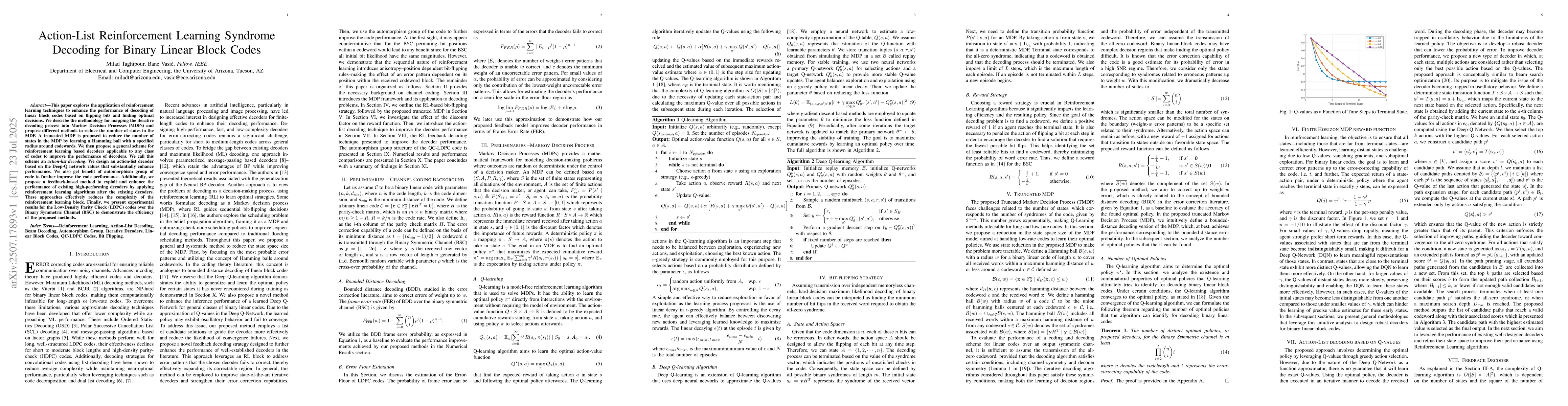 This paper explores the application of reinforcement learning techniques to enhance the performance of decoding of linear block codes based on flipping bits and finding optimal decisions. We describe the methodology for mapping the iterative decoding process into Markov Decision Processes (MDPs) and propose different methods to reduce the number of states in the MDP. A truncated MDP is proposed to reduce the number of states in the MDP by learning a Hamming ball with a specified radius around codewords. We then propose a general scheme for reinforcement learning based decoders applicable to any class of codes to improve the performance of decoders. We call this scheme an action-list decoding. We design an action-list decoder based on the Deep-Q network values that substantially enhance performance. We also get benefit of automorphism group of code to further improve the code performance. Additionally, we propose a feedback-based method to exploit and enhance the performance of existing high-performing decoders by applying reinforcement learning algorithms after the existing decoders. These approaches effectively reduces the complexity of the reinforcement learning block. Finally, we present experimental results for the Low-Density Parity Check (LDPC) codes over the Binary Symmetric Channel (BSC) to demonstrate the efficiency of the proposed methods.