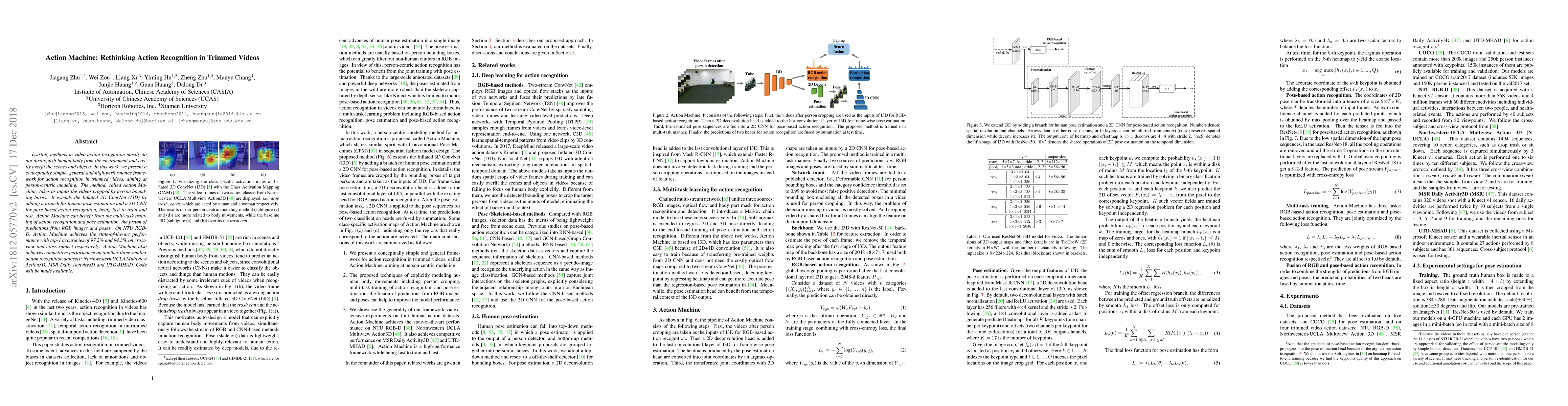 Action Machine introduces a novel framework for person-centric action recognition in trimmed videos, enhancing the Inflated 3D ConvNet with pose estimation and 2D CNN, achieving state-of-the-art results on NTU RGB-D and other datasets. The method benefits from multi-task training and fusion of RGB and pose data.