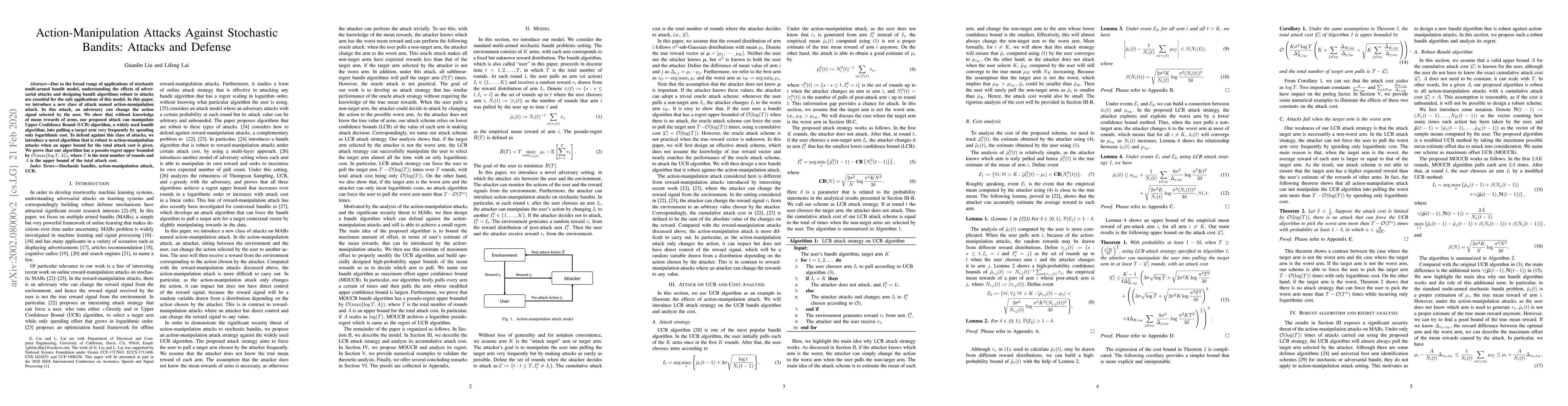 A new attack type called action-manipulation attacks can deceive a UCB algorithm into favoring a specific arm, while a novel defense algorithm mitigates this threat with pseudo-regret upper bounded by O(log T + A)