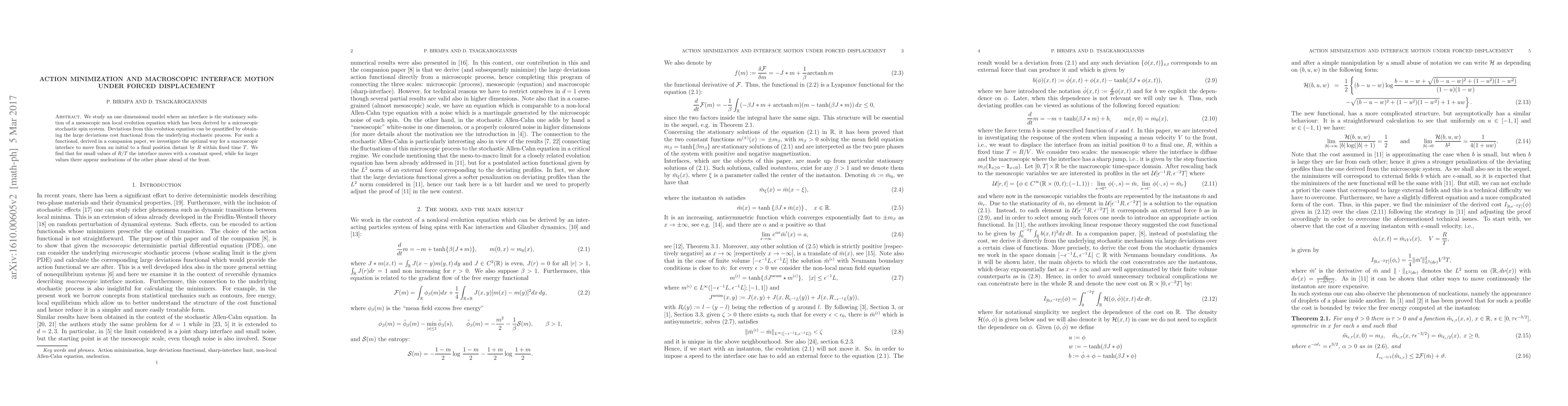 We study an one dimensional model where an interface is the stationary solution of a mesoscopic non local evolution equation which has been derived by a microscopic stochastic spin system. Deviations from this evolution equation can be quantified by obtaining the large deviations cost functional from the underlying stochastic process. For such a functional, derived in a companion paper, we investigate the optimal way for a macroscopic interface to move from an initial to a final position distant by R within fixed time T. We find that for small values of R/T the interface moves with a constant speed, while for larger values there appear nucleations of the other phase ahead of the front.