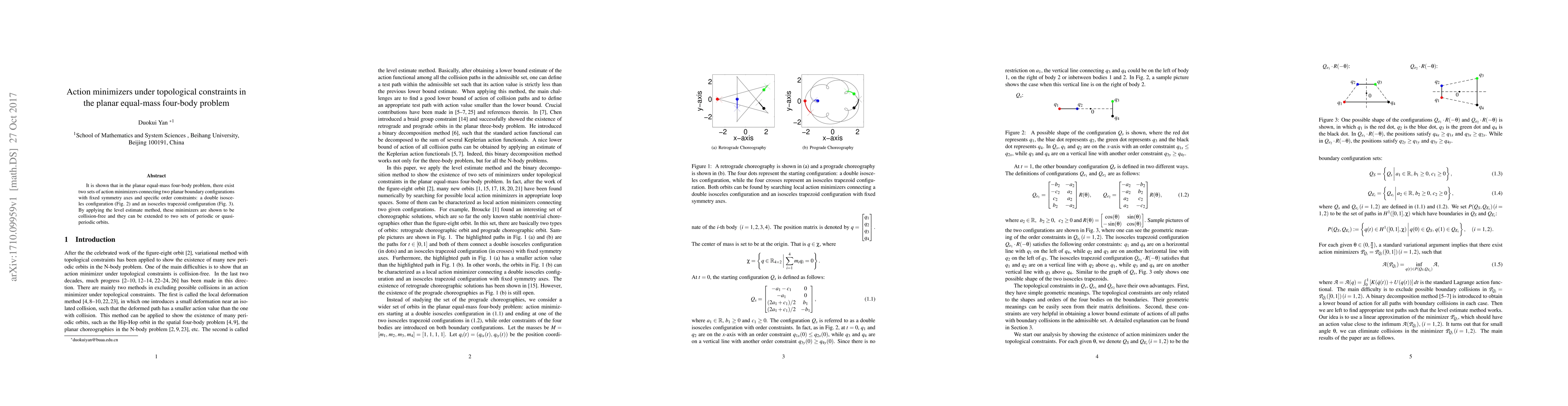 Summary: The paper identifies two new sets of action minimizers in the planar equal-mass four-body problem, featuring double isosceles and isosceles trapezoid configurations. These configurations are collision-free and can be extended to periodic or quasi-periodic orbits.
