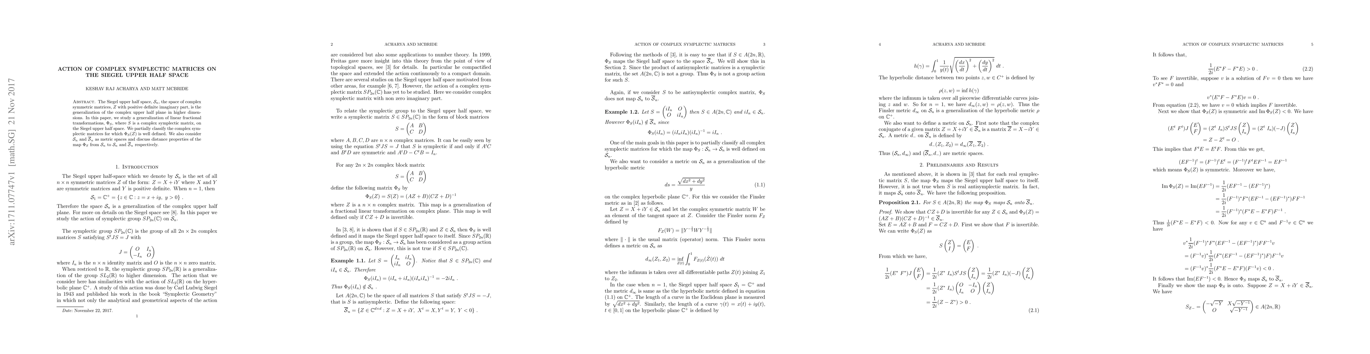 This paper investigates the action of complex symplectic matrices on the Siegel upper half space, $\mathcal{S}_n$, and classifies those matrices for which the associated transformation, $\Phi_S$, is well-defined. It also explores the metric properties of $\Phi_S$ as a map between $\mathcal{S}_n$ and its closure $\overline{\mathcal S}_n$.