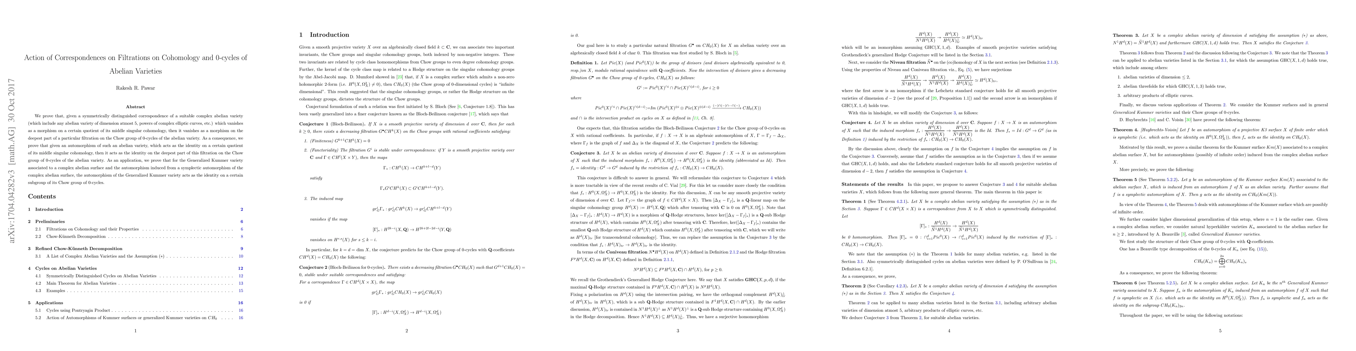This paper proves that certain correspondences on complex abelian varieties that vanish on specific quotients of middle singular cohomology also vanish on the deepest part of a filtration on the Chow group of 0-cycles. It follows that automorphisms acting trivially on the cohomology also act trivially on this filtration, with an application to Generalized Kummer varieties.