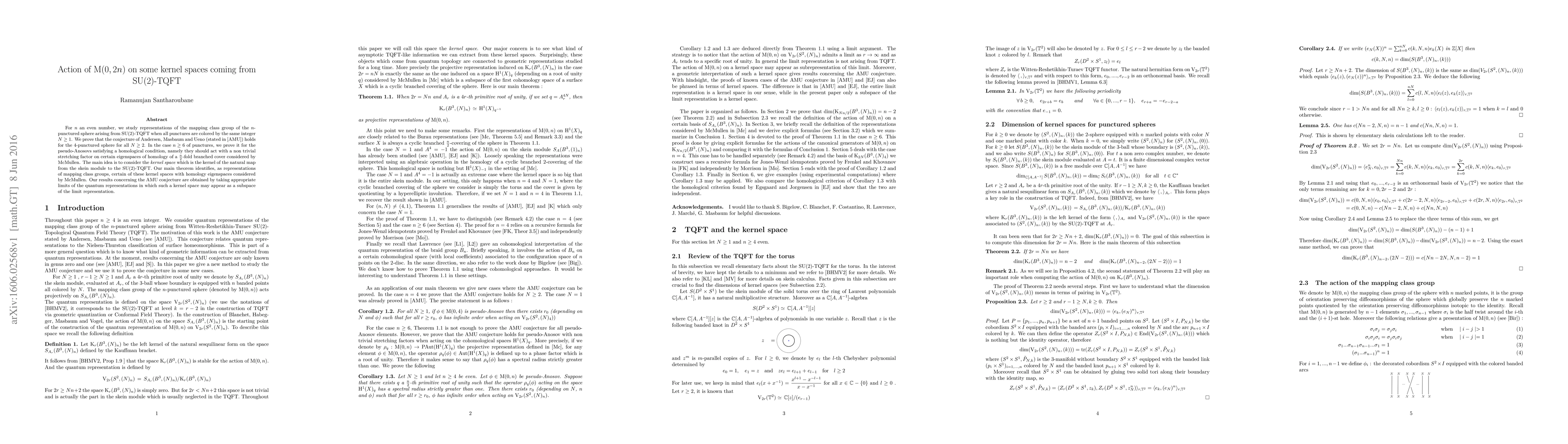 For $n$ an even number, we study representations of the mapping class group of the $n$-punctured sphere arising from $\mathrm{SU}(2)$-TQFT when all punctures are colored by the same integer $N \geq 1$. We prove that the conjecture of Andersen, Masbaum and Ueno holds for the $4$-punctured sphere for all $N \geq 2$. In the case $n \geq 6$ of punctures, we prove it for the pseudo-Anosovs satisfying a homological condition, namely they should act with a non trivial stretching factor on certain eigenspaces of homology of a $\frac{n}{2}$-fold branched cover considered by McMullen. The main idea is to consider the kernel space which is the kernel of the natural map from the skein module to the $\mathrm{SU}(2)$-TQFT. Our main theorem identifies, as representations of mapping class groups, certain of these kernel spaces with homology eigenspaces considered by McMullen. Our results concerning the AMU conjecture are obtained by taking appropriate limits of the quantum representations in which such a kernel space may appear as a subspace of the limit representation.