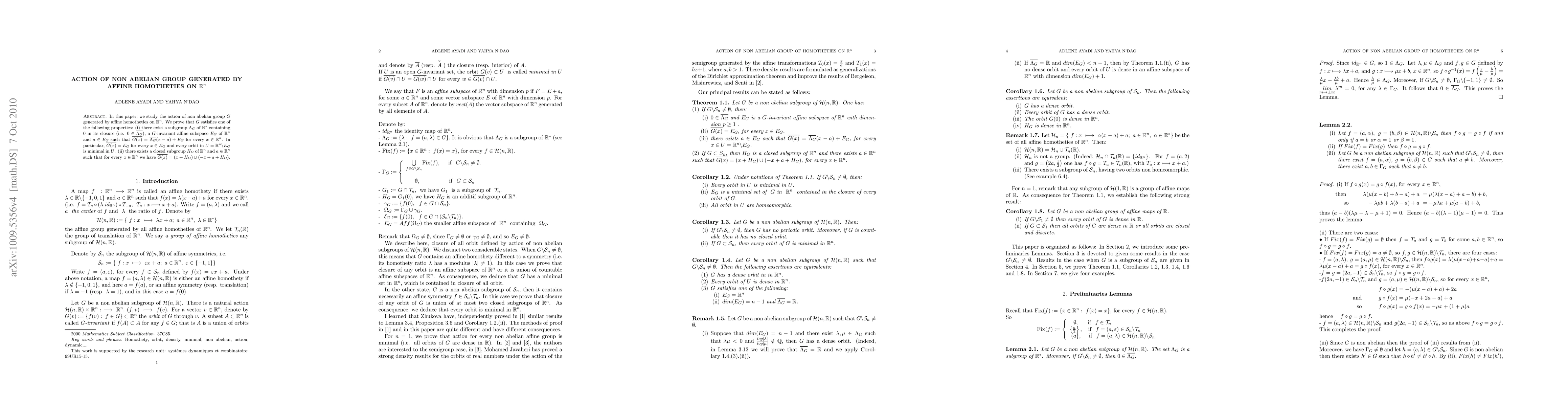 This research paper examines the action of a non-abelian group G, generated by affine homotheties in R^n. It's proven that G either creates dense orbits in an invariant affine subspace or forms orbits that are either closed translates of a subgroup or symmetrical combinations of such translates, providing insights into group actions in geometric contexts.