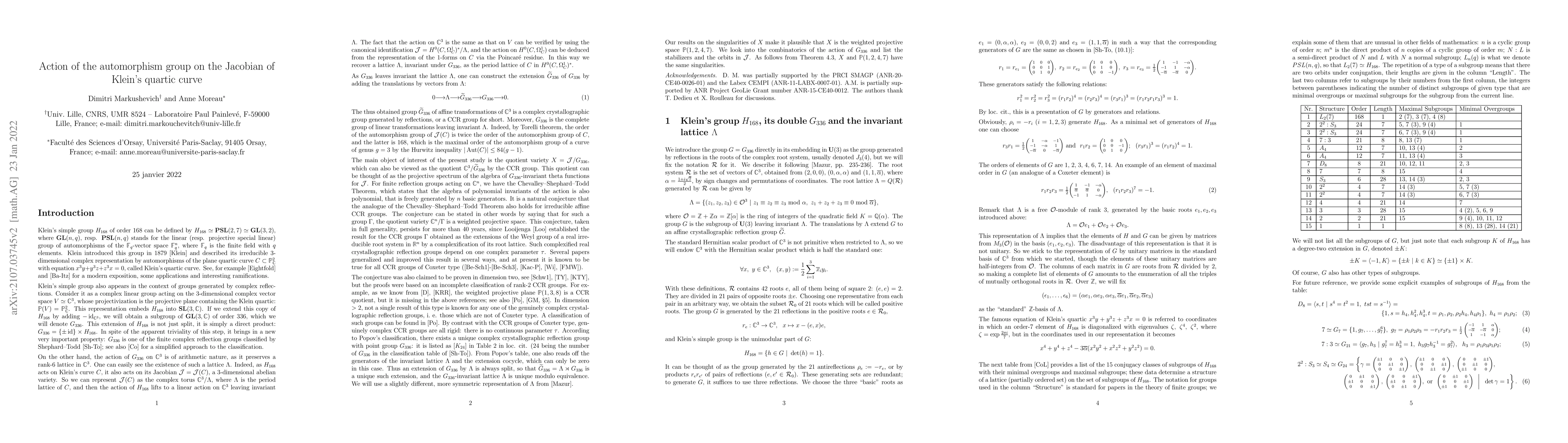 This paper explores the action of the automorphism group $G$ on the Jacobian $J$ of Klein's quartic curve, demonstrating that $J/G$ is isomorphic to $\mathbb C^3/\tilde G$. It concludes that this quotient variety shares singularities with the weighted projective space $\mathbb P(1,2,4,7)$, supporting a conjecture about crystallographic groups generated by reflections.