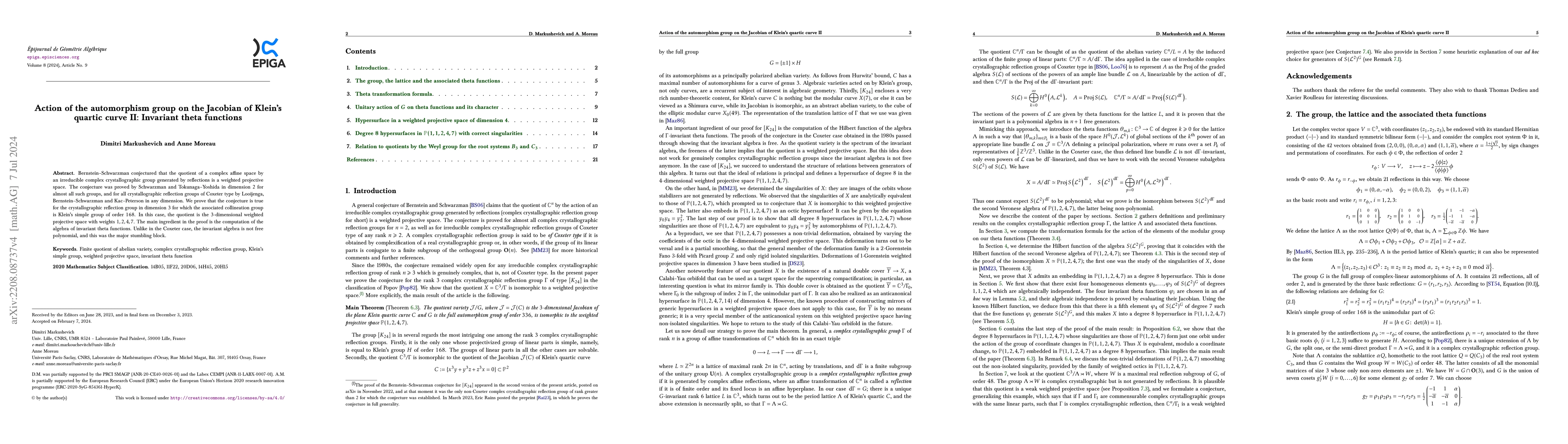 This paper proves the Bernstein-Schwarzman conjecture for the crystallographic reflection group in dimension 3 associated with Klein's simple group, showing the quotient is a 3-dimensional weighted projective space with weights 1, 2, 4, 7. The key to the proof lies in computing the non-free polynomial algebra of invariant theta-functions.