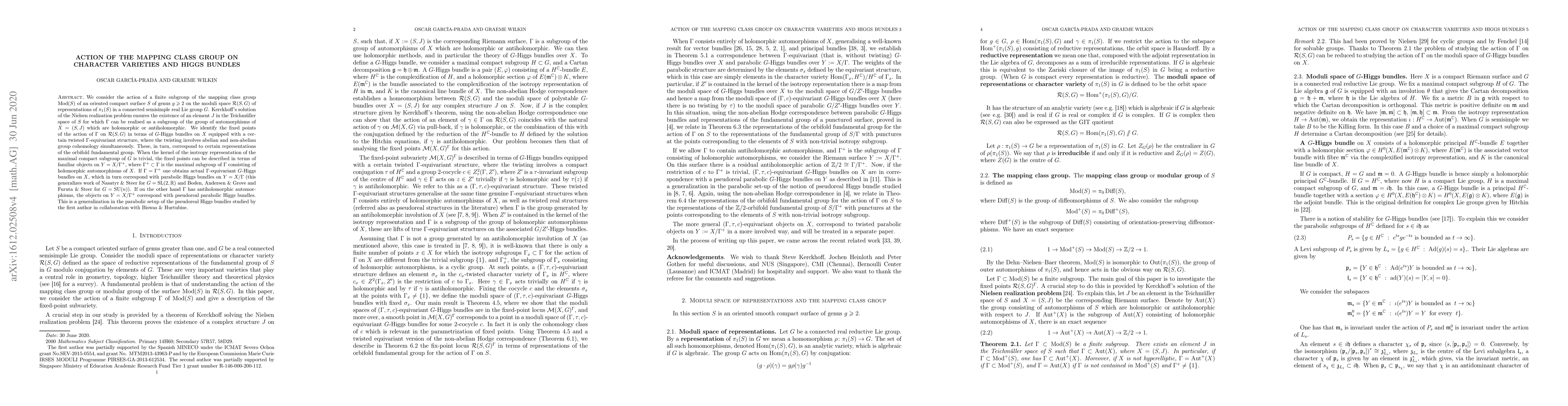 Researchers explore how a finite subgroup of the mapping class group acts on character varieties and Higgs bundles, leading to generalizations of previous work in parabolic setups and connections to pseudoreal Higgs bundles.