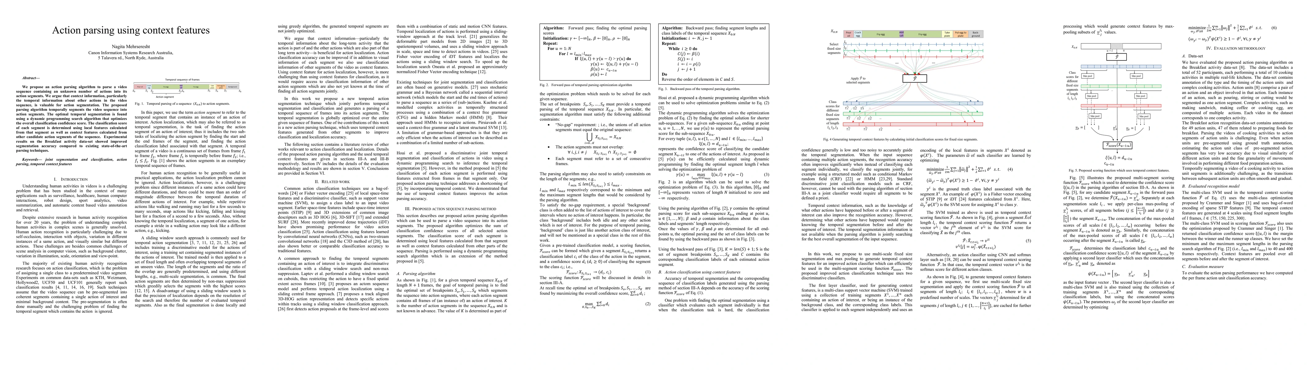 This paper proposes an action parsing algorithm that segments a video into action segments using context features, including temporal information about other actions. The algorithm employs dynamic programming to optimize segmentation based on classification confidence scores, achieving better segmentation accuracy on the Breakfast activity dataset compared to existing methods.