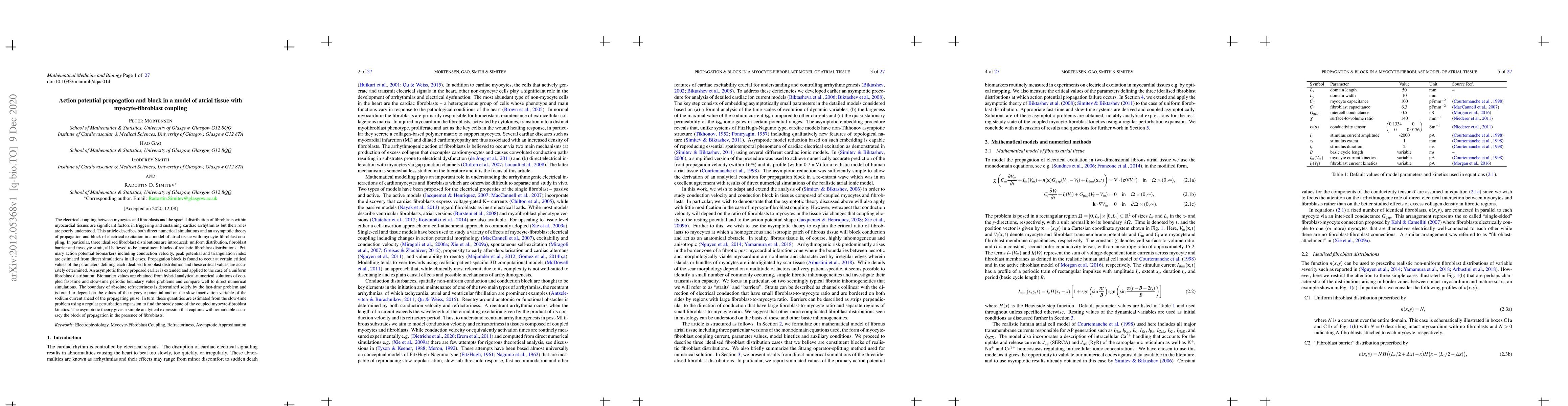 The electrical coupling between myocytes and fibroblasts and the spacial distribution of fibroblasts within myocardial tissues are significant factors in triggering and sustaining cardiac arrhythmias but their roles are poorly understood. This article describes both direct numerical simulations and an asymptotic theory of propagation and block of electrical excitation in a model of atrial tissue with myocyte-fibroblast coupling. In particular, three idealised fibroblast distributions are introduced: uniform distribution, fibroblast barrier and myocyte strait, all believed to be constituent blocks of realistic fibroblast distributions. Primary action potential biomarkers including conduction velocity, peak potential and triangulation index are estimated from direct simulations in all cases. Propagation block is found to occur at certain critical values of the parameters defining each idealised fibroblast distribution and these critical values are accurately determined. An asymptotic theory proposed earlier is extended and applied to the case of a uniform fibroblast distribution. Biomarker values are obtained from hybrid analytical-numerical solutions of coupled fast-time and slow-time periodic boundary value problems and compare well to direct numerical simulations. The boundary of absolute refractoriness is determined solely by the fast-time problem and is found to depend on the values of the myocyte potential and on the slow inactivation variable of the sodium current ahead of the propagating pulse. In turn, these quantities are estimated from the slow-time problem using a regular perturbation expansion to find the steady state of the coupled myocyte-fibroblast kinetics. The asymptotic theory gives a simple analytical expression that captures with remarkable accuracy the block of propagation in the presence of fibroblasts.