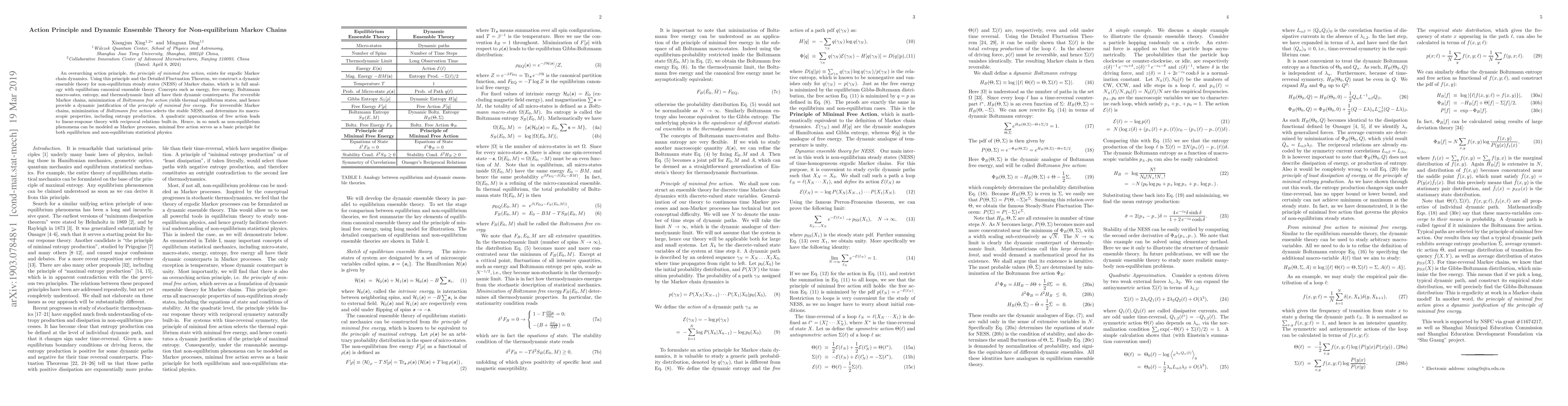 An overarching action principle, the principle of minimal free action, exists for ergodic Markov chain dynamics. Using this principle and the Detailed Fluctuation Theorem, we construct a dynamic ensemble theory for non-equilibrium steady states (NESS) of Markov chains, which is in full analogy with equilibrium canonical ensemble theory. Concepts such as energy, free energy, Boltzmann macro-sates, entropy, and thermodynamic limit all have their dynamic counterparts. For reversible Markov chains, minimization of Boltzmann free action yields thermal equilibrium states, and hence provide a dynamic justification of the principle of minimal free energy. For irreversible Markov chains, minimization of Boltzmann free action selects the stable NESS, and determines its macroscopic properties, including entropy production. A quadratic approximation of free action leads to linear-response theory with reciprocal relations built-in. Hence, in so much as non-equilibrium phenomena can be modeled as Markov processes, minimal free action serves as a basic principle for both equilibrium and non-equilibrium statistical physics.
