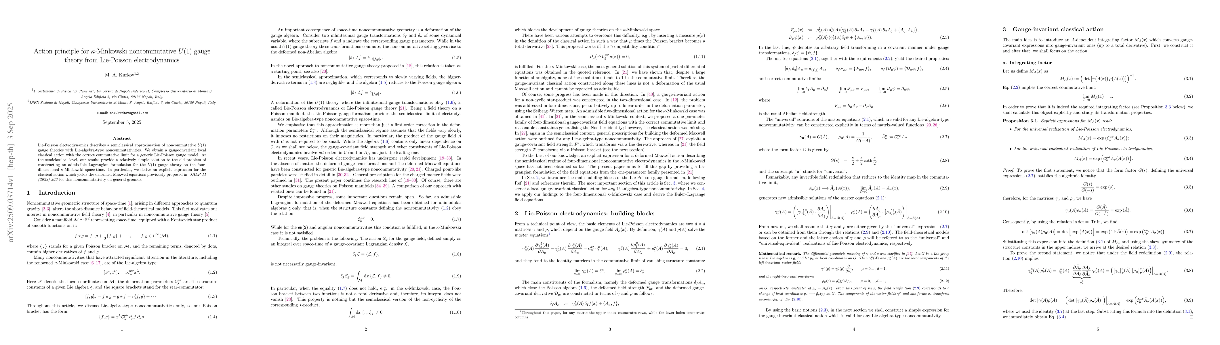 Lie-Poisson electrodynamics describes a semi-classical approximation of noncommutative $U(1)$ gauge theories with Lie-algebra-type noncommutativities. We obtain a gauge-invariant local classical action with the correct commutative limit for a generic Lie-Poisson gauge model. At the semi-classical level, our results provide a relatively simple solution to the old problem of constructing an admissible Lagrangian formulation for the $U(1)$ gauge theory on the four-dimensional $\kappa$-Minkowski space-time. In particular, we derive an explicit expression for the classical action which yields the deformed Maxwell equations previously proposed in JHEP 11 (2023) 200 for this noncommutativity on general grounds.