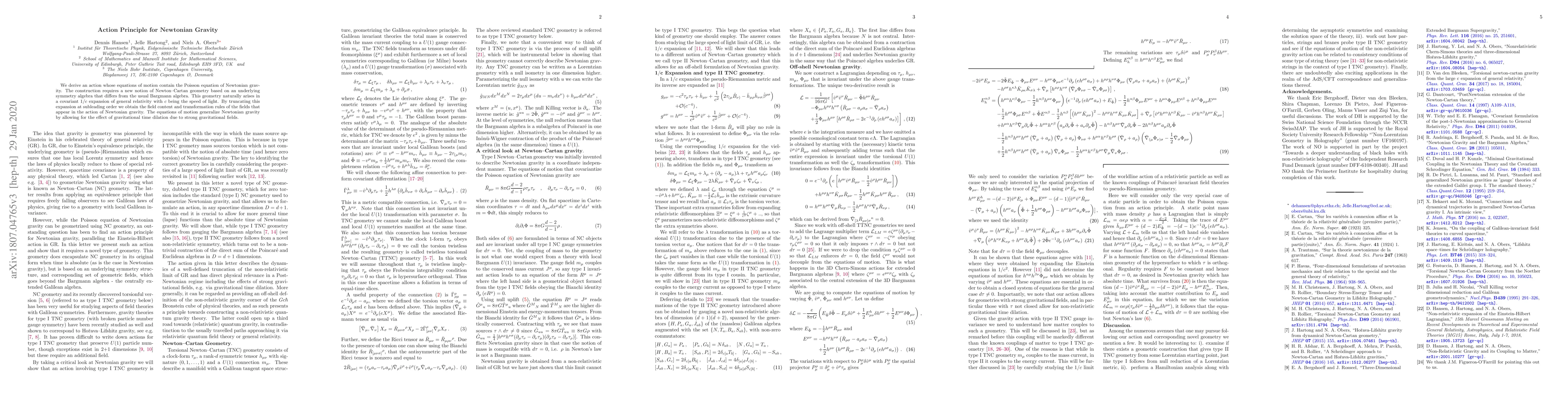 We derive an action whose equations of motion contain the Poisson equation of Newtonian gravity. The construction requires a new notion of Newton--Cartan geometry based on an underlying symmetry algebra that differs from the usual Bargmann algebra. This geometry naturally arises in a covariant $1/c$ expansion of general relativity with $c$ the speed of light. By truncating this expansion at subleading order we obtain the field content and transformation rules of the fields that appear in the action of Newtonian gravity. The equations of motion generalize Newtonian gravity by allowing for the effect of gravitational time dilation due to strong gravitational fields.