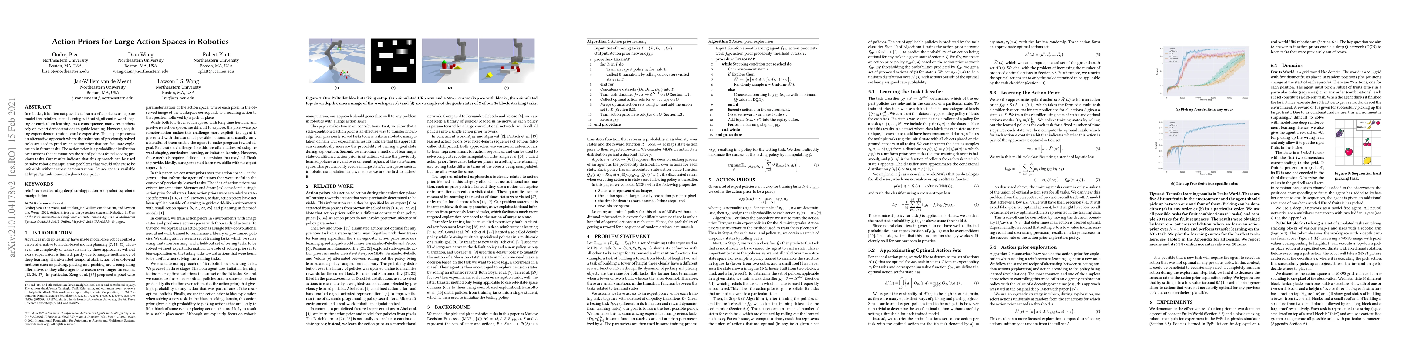 In robotics, it is often not possible to learn useful policies using pure model-free reinforcement learning without significant reward shaping or curriculum learning. As a consequence, many researchers rely on expert demonstrations to guide learning. However, acquiring expert demonstrations can be expensive. This paper proposes an alternative approach where the solutions of previously solved tasks are used to produce an action prior that can facilitate exploration in future tasks. The action prior is a probability distribution over actions that summarizes the set of policies found solving previous tasks. Our results indicate that this approach can be used to solve robotic manipulation problems that would otherwise be infeasible without expert demonstrations. Source code is available at \url{https://github.com/ondrejba/action_priors}.