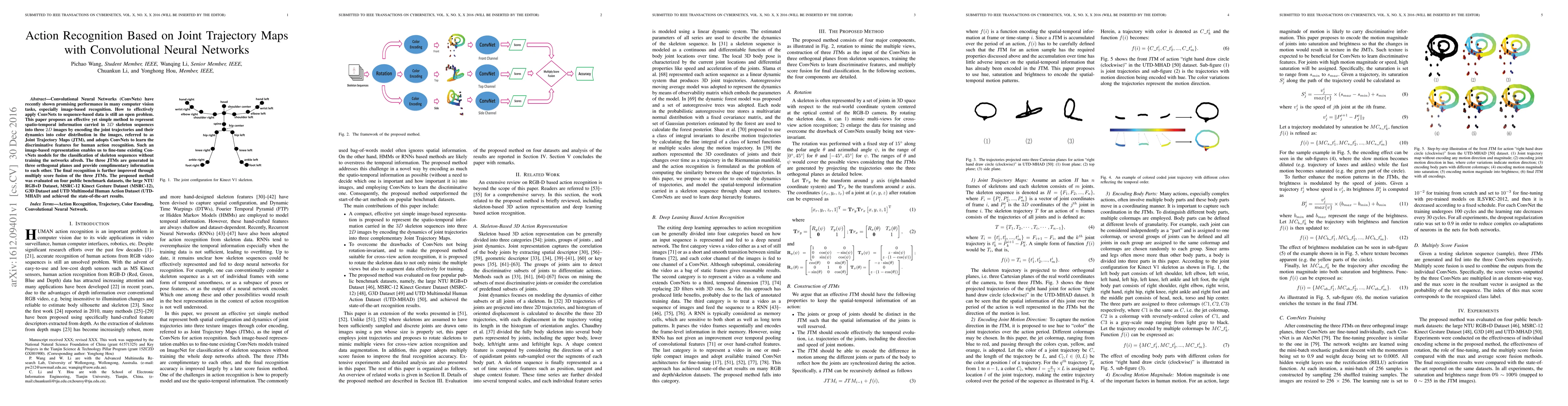 This paper proposes a method to represent 3D skeleton sequences as Joint Trajectory Maps (JTM) to encode spatio-temporal information into 2D images for ConvNets-based action recognition. The method achieves state-of-the-art results on four benchmark datasets by fusing discriminative features from three orthogonal JTMs.