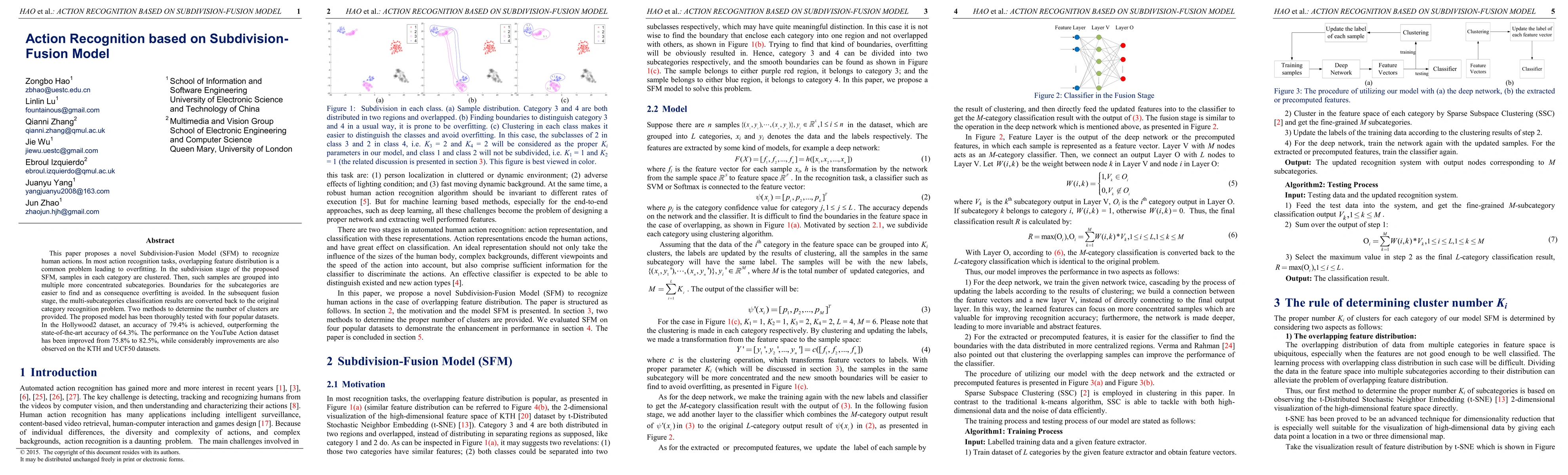 This paper proposes a novel Subdivision-Fusion Model (SFM) to recognize human actions. In most action recognition tasks, overlapping feature distribution is a common problem leading to overfitting. In the subdivision stage of the proposed SFM, samples in each category are clustered. Then, such samples are grouped into multiple more concentrated subcategories. Boundaries for the subcategories are easier to find and as consequence overfitting is avoided. In the subsequent fusion stage, the multi-subcategories classification results are converted back to the original category recognition problem. Two methods to determine the number of clusters are provided. The proposed model has been thoroughly tested with four popular datasets. In the Hollywood2 dataset, an accuracy of 79.4% is achieved, outperforming the state-of-the-art accuracy of 64.3%. The performance on the YouTube Action dataset has been improved from 75.8% to 82.5%, while considerably improvements are also observed on the KTH and UCF50 datasets.