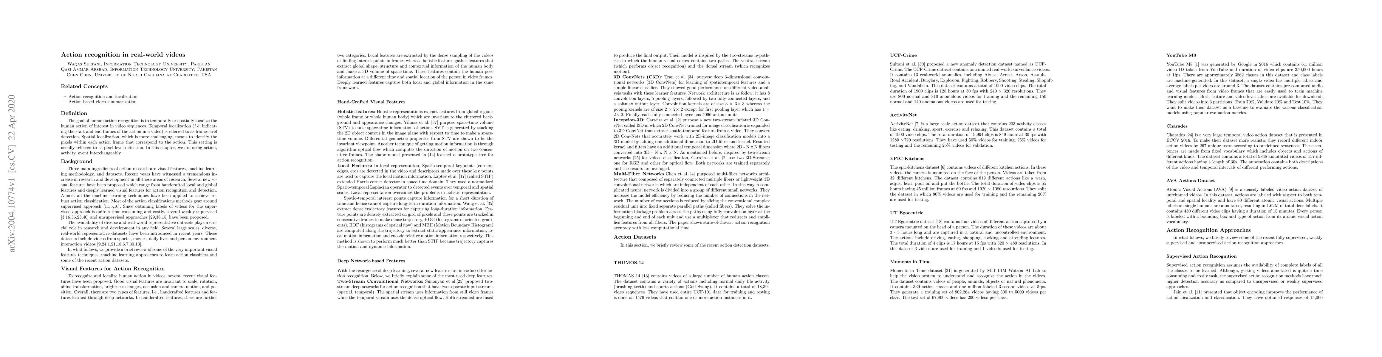 The goal of human action recognition is to temporally or spatially localize the human action of interest in video sequences. Temporal localization (i.e. indicating the start and end frames of the action in a video) is referred to as frame-level detection. Spatial localization, which is more challenging, means to identify the pixels within each action frame that correspond to the action. This setting is usually referred to as pixel-level detection. In this chapter, we are using action, activity, event interchangeably.