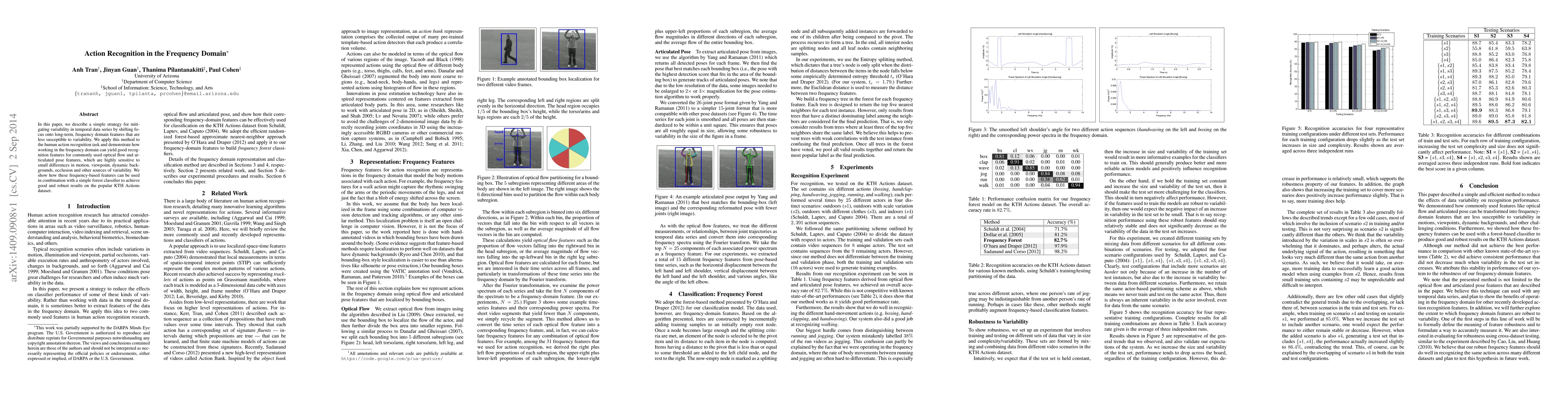 This paper proposes a method to improve human action recognition by focusing on less variable, long-term frequency domain features instead of temporal data series. By applying this approach to optical flow and articulated pose features, the researchers achieve robust results on the KTH Actions dataset using a simple forest classifier.