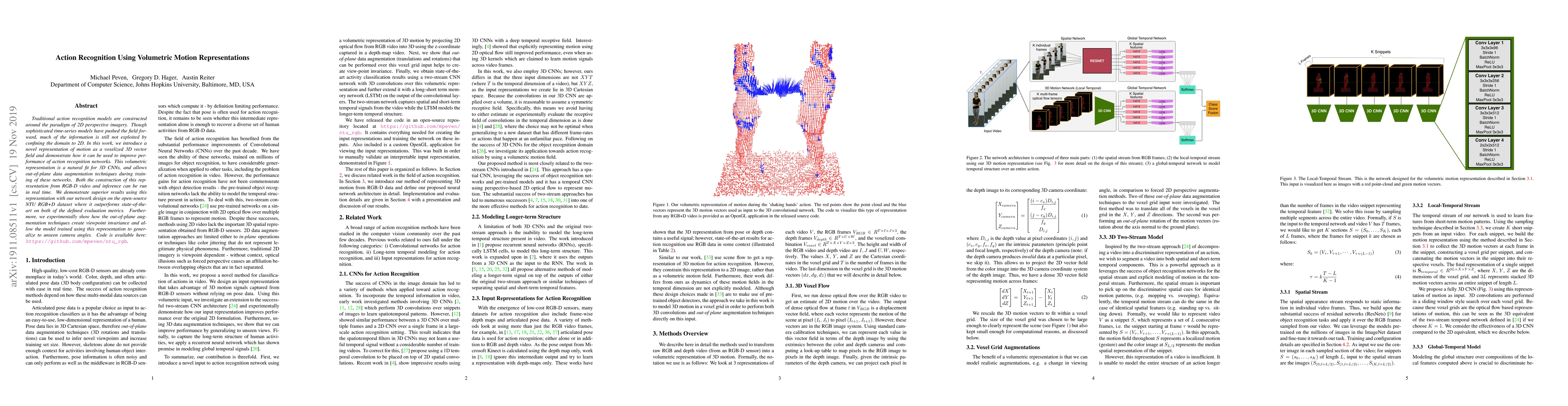 Traditional action recognition models are constructed around the paradigm of 2D perspective imagery. Though sophisticated time-series models have pushed the field forward, much of the information is still not exploited by confining the domain to 2D. In this work, we introduce a novel representation of motion as a voxelized 3D vector field and demonstrate how it can be used to improve performance of action recognition networks. This volumetric representation is a natural fit for 3D CNNs, and allows out-of-plane data augmentation techniques during training of these networks. Both the construction of this representation from RGB-D video and inference can be run in real time. We demonstrate superior results using this representation with our network design on the open-source NTU RGB+D dataset where it outperforms state-of-the-art on both of the defined evaluation metrics. Furthermore, we experimentally show how the out-of-plane augmentation techniques create viewpoint invariance and allow the model trained using this representation to generalize to unseen camera angles. Code is available here: https://github.com/mpeven/ntu_rgb.