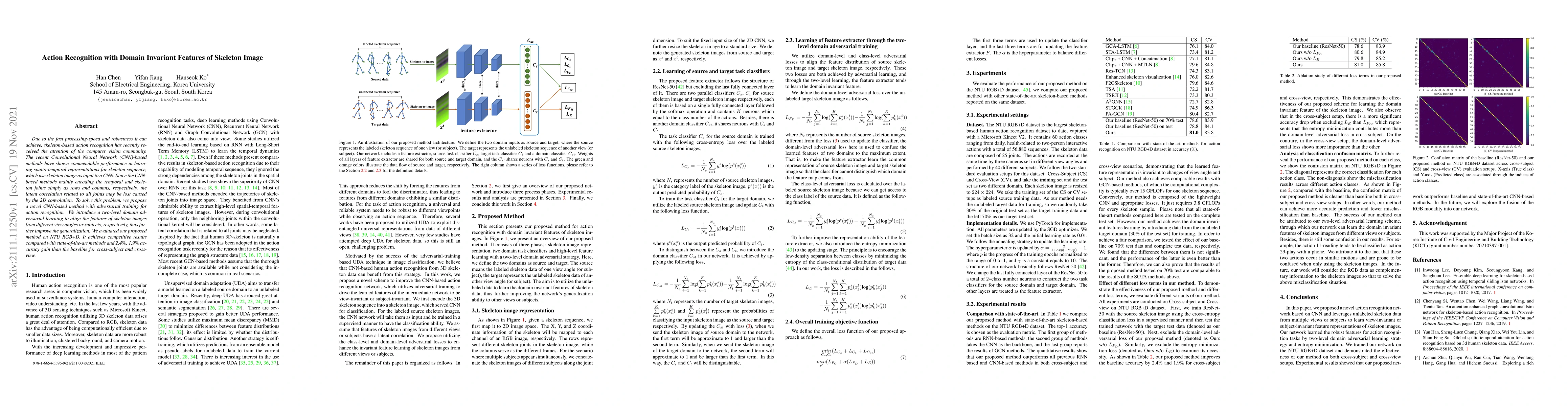 This paper proposes a novel CNN-based method with adversarial training for skeleton-based action recognition to enhance domain invariance, achieving a 2.4% and 1.9% accuracy gain over baseline for cross-subject and cross-view tests on NTU RGB+D. The approach aligns features from different perspectives to improve generalization.