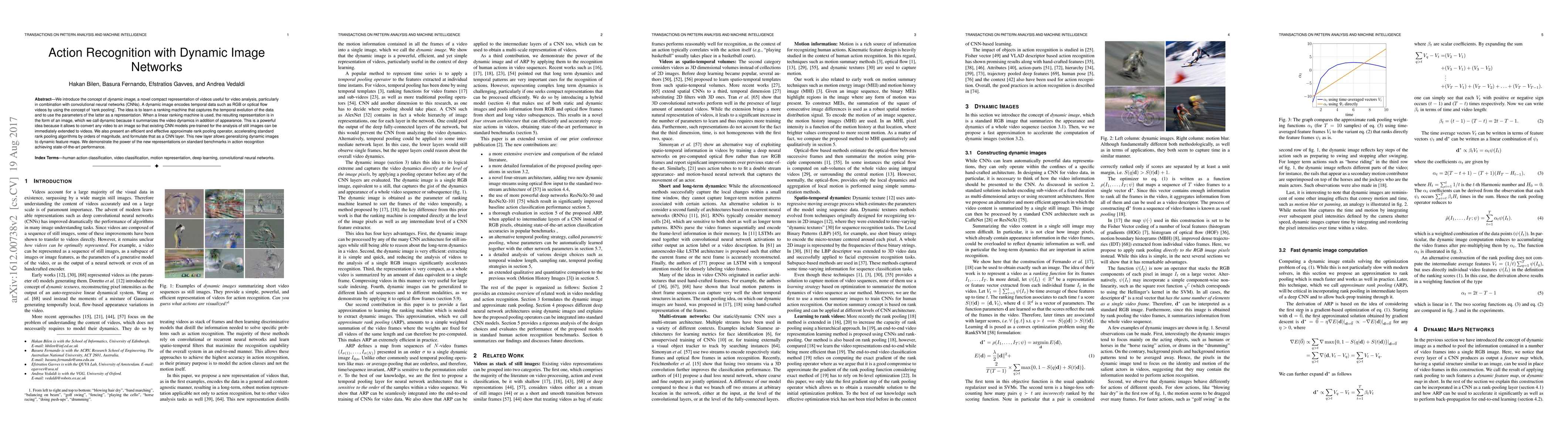 This research introduces "dynamic images," a novel representation of videos that leverages rank pooling to encode temporal data, enabling convolutional neural networks to analyze video content efficiently. The proposed dynamic image approach converts videos into images, allowing pre-trained CNN models for still images to be applied to video analysis, achieving state-of-the-art results in action recognition benchmarks.